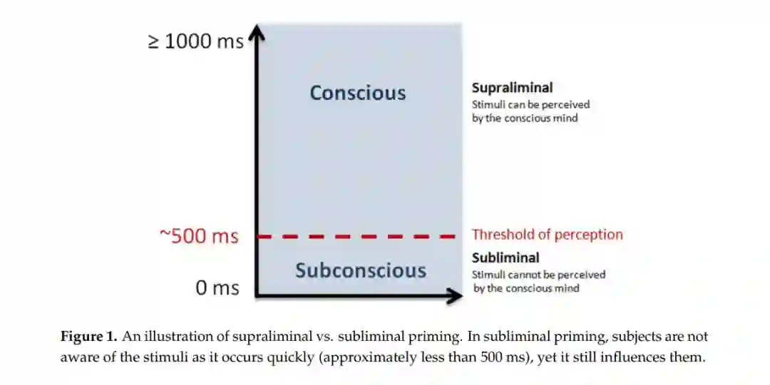 启动效应是指由于事先接触了相关的视觉或音频信息([1])而增加的对某些刺激的敏感性。例如,当一个人接触到“癌症”这个词,然后提供吸烟的选择时,我们预计,由于较早的接触,他们选择不吸烟的可能性更大。当个体暴露于低于感知阈值[2]的刺激时,就会发生阈下启动,如图1所示。这一过程发生在意识领域之外,与依赖于直接检索信息的记忆不同。