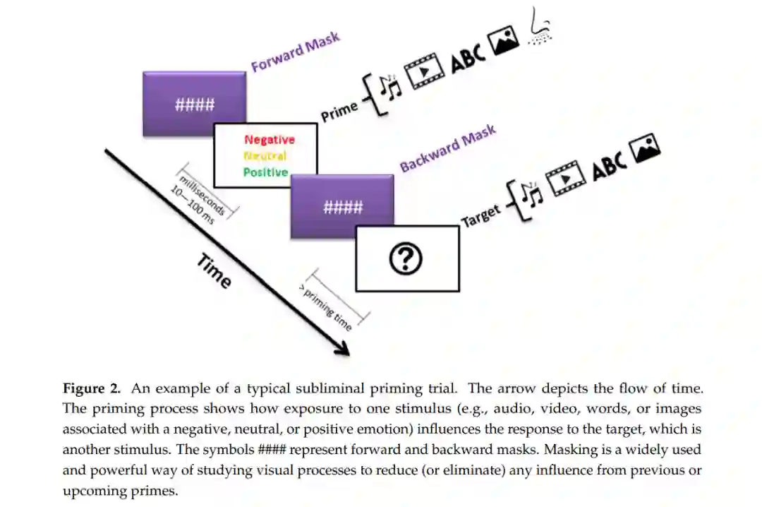 阈下启动是基于低于有意识检测阈值[3]的“启动”刺激而建立的。先前的文献强调,与高于阈值[4]的信息相比,低于有意识检测阈值的信息可以引发“扩散处理”。扩散处理发生时,刺激溢出到一个时间邻近的刺激。例如,潜意识呈现的微笑和皱眉面孔被证明会积极和消极地改变随后呈现的情感中立的中文表意者的评价评价[5]。在临床和研究中,阈下启动依赖于采样的特定指标和测量它们的时间范围。潜意识可能随着时间的推移而变化,作为性格因素和环境变量的函数。因此,理解、研究和应用这一概念需要一个强有力的概念模型和度量模型。阈下启动在心理学研究中被广泛研究,通常用于市场研究。在认知心理学研究中,阈下启动研究方法通常包括非常短的实验观察期(毫秒),以了解短暂的暴露对个体在后续刺激下的决策的影响(见图2)[7]。这些研究的方法和结果越来越多地用于社会和健康科学,包括广告、人机交互和政治竞选。对阈下启动的透彻理解对于优化这项跨科学研究的结果和性能至关重要。对该主题提供有组织的概述将有助于研究人员了解该领域的当前研究主体。