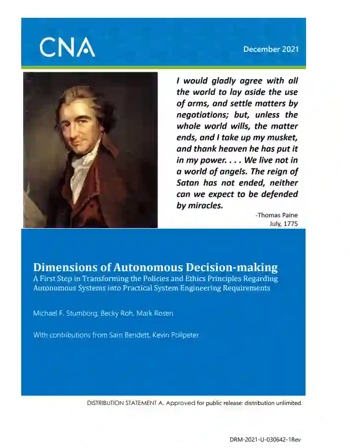 这项研究确定了自主决策的维度(DADs)--在将决策能力转移到智能自主系统(IAS)之前,人们应该考虑的潜在风险类别和原因。这项研究的目的是提供一些执行现有策略所需的工具,涉及法律、道德和军事上有效使用IAS的问题。这些工具有助于识别并减轻或接受与使用IAS有关的可能导致负面结果的风险。这13个确定的DADs是由565个 "风险要素 "组成的综合清单制定的,这些要素来自于支持和反对在武器系统中使用自主技术的各方所撰写的数百份文件。我们将这些要素以问题的形式记录下来,以便采购界在制定确保自主系统的道德使用的需求文件时使用,并由军事指挥官作为风险评估清单,确保自主系统不会以不道德的方式使用。这样,美国防部就可以在开发或部署自主系统之前做出完全知情的风险评估决定。
