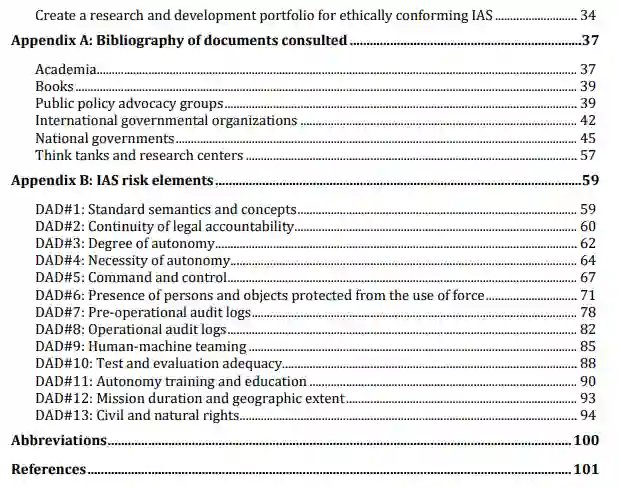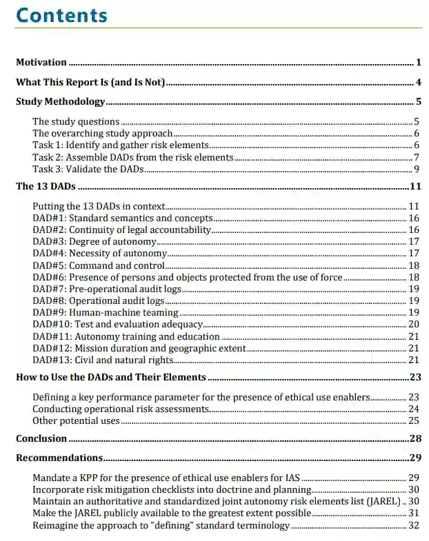 本研究确定的13个DADs是由565个 "风险要素 "组成的综合清单制定的,这些风险要素来自于全球支持和反对在武器系统中使用自主技术的人士撰写的数百份文件。此外,这些风险项目超出了国防部目前的政策和程序,因为我们预计这些政策和程序会发生变化,而且自主技术会不断发展。我们以问题的形式捕捉每个风险要素。然后,每一项都可以很容易地被修改为 "必须声明",供采购界在制定功能要求时使用,以确保合法和道德地使用自主系统。这种方法可以将人工智能(AI)伦理从一套主观定义的、因而无法行动的政策和原则,提升为一套可衡量和可测试的合同义务。