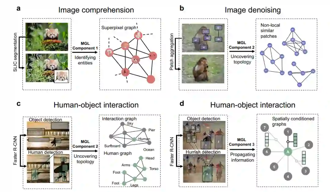 图3 多模态图学习蓝图在图像中的应用。a,用于图像理解的模态识别,其中节点代表SLIC分割算法生成的聚集的感兴趣区域或超像素。b,图像去噪的拓扑发现,图像补丁(节点)连接到其他非局部相似的补丁。c,创建两个图的人机交互中的拓扑揭示。以人类为中心的图将身体各部分映射到它们的解剖邻居,并通过相互作用将身体各部分相对于图像中其他物体的距离连接起来。d,人-物体交互中的信息传播,其中空间条件图修改消息传递,以合并强制图像中对象的相对方向的边缘特征[50]。