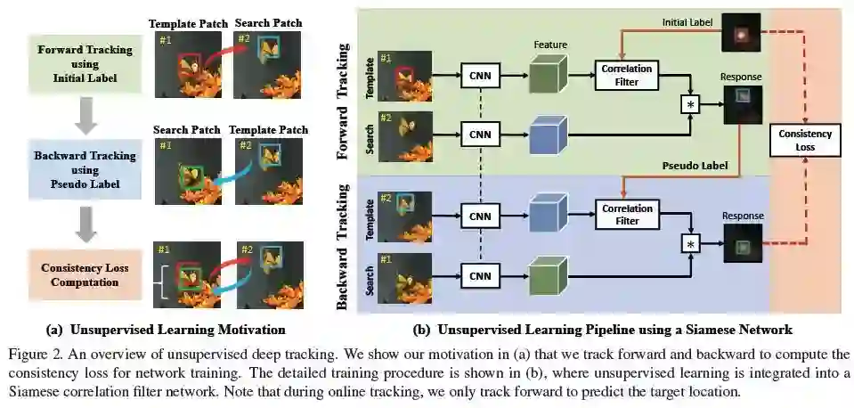 摘要:我们在本文中提出了一种无监督视觉跟踪方法。与现有的使用大量标注数据进行监督学习的方法不同,我们的CNN模型是以一种无监督的方式对大规模无标记视频进行训练的。我们的动机是,一个健壮的跟踪器应该在前向和后向预测中都是有效的(即,跟踪器可以在连续帧中对目标对象进行前向定位,并在第一帧中回溯到目标对象的初始位置)。我们在Siamese相关滤波器网络上构建了我们的框架,该网络使用未标记的原始视频进行训练。同时,我们提出了一种多帧验证方法和代价敏感的损失函数,以方便无监督学习。在没有监督信息的情况下(without bells and whistles),所提出的无监督跟踪器达到了完全监督跟踪器的baseline精度,这需要在训练过程中完整且准确的标签。此外,无监督框架显示了利用无标记或弱标记数据进一步提高跟踪精度的潜力。