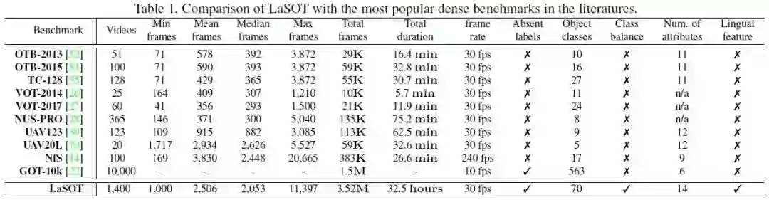 摘要:本文提出了一种用于大规模单目标跟踪的高质量基准LaSOT。LaSOT由1400个序列组成,总帧数超过350万。这些序列中的每一帧都小心翼翼地用一个边界框手工标注,使LaSOT成为我们所知最大的、标注密集的跟踪基准。LaSOT的平均视频长度超过2500帧,每个序列都包含来自野外的各种挑战,在野外,目标对象可能会消失,然后重新出现在视图中。通过发布LaSOT,我们希望为社区提供一个大规模、高质量的专用基准,用于深度跟踪器的训练和跟踪算法的真实评估。此外,考虑到视觉外观与自然语言的紧密联系,我们通过提供额外的语言规范来丰富LaSOT,旨在鼓励探索自然语言特征来进行跟踪。对LaSOT上的35种跟踪算法进行了全面的实验评估,并进行了详细的分析,结果表明,该算法仍有很大的改进空间。