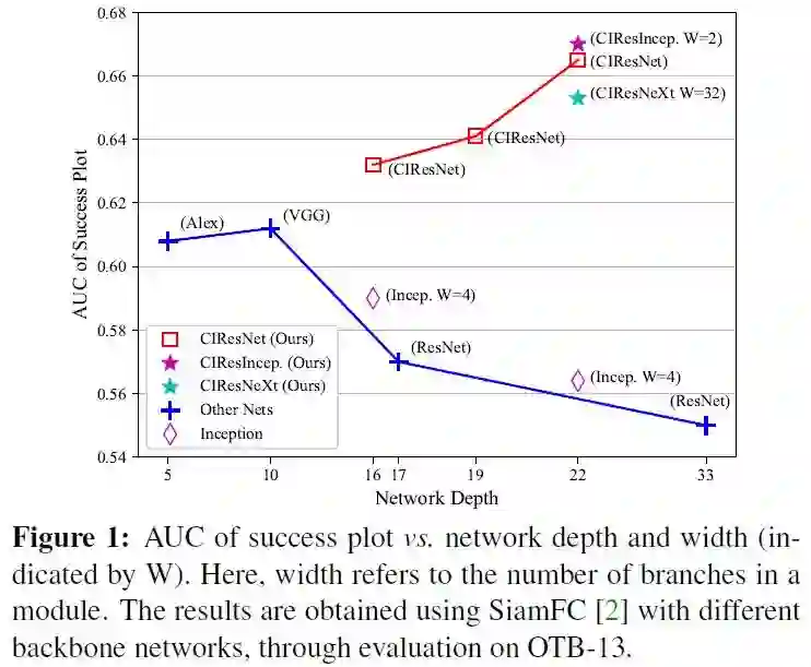 摘要:Siamese网络以其均衡的精度和速度在视觉跟踪领域引起了广泛的关注。然而,Siamese跟踪器中使用的主干网络相对较浅,如AlexNet[18],没有充分利用现代深度神经网络的优势。在本文中,我们研究如何利用更深更广的卷积神经网络来提高跟踪的鲁棒性和准确性。我们注意到,用现有的强大架构(如ResNet[14]和Inception[33])直接替换主干网络并不能带来改进。主要原因是1)神经元接受域的大量增加导致特征识别率和定位精度下降;2)卷积的网络padding导致了学习中的位置偏差。为了解决这些问题,我们提出了新的residual模块,以消除padding的负面影响,并进一步设计使用这些模块的新的架构控制感知域大小和网络步长。设计的架构非常轻巧,并且在应用于SiamFC [2]和SiamRPN [20]时保证了实时跟踪速度。实验表明,仅由于提出的网络架构,我们的SiamFC+和SiamRPN+在OTB-15、VOT-16和VOT-17数据集上分别获得了9.8%/5.7% (AUC)、23.3%/8.8% (EAO)和24.4%/25.0% (EAO)的相对改进[2,20]。
