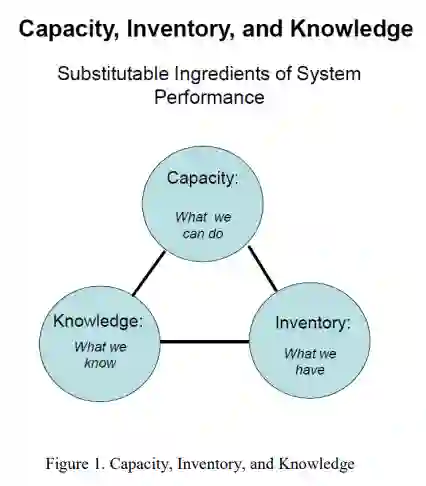 军事组织,尤其是成功的军事组织,以其强大的文化而闻名。然而,军事创新的漫长历史表明,当失败逼近时,这些文化也可能成为组织适应的障碍。组织变革总会引发阻力,尤其是在需要一致性的庞大官僚机构中。而且,当然,我们集体的人类本性倾向于拖延,直到危机降临。为克服官僚惰性和颠覆性混乱引起的瘫痪,文化必须拥有它们能够接纳的创新源泉。需要某种机制或方法论来挑战当前实践的基本逻辑,并同时展示更好的前进道路,以实现平稳过渡,而非灾难性或慢动作的失败。“战略分析学”可以提供这样的架构。尽管科学进步持续令我们惊叹,但我们必须更好地理解技术、管理和政策在我们复杂的社会技术企业系统中如何相互作用。管理创新常常滞后于技术进步,但对于充分利用快速增长的大数据机遇至关重要。这个新的战略分析学框架将“目的-途径-手段”战略范式与相应的规范性、预测性和描述性分析领域对齐,聚焦于组织存在的最终目的。描述性分析对问题进行细分,诊断结构性失调,并识别可行的补救措施和潜在的“创新催化剂”(“手段”)。接下来,一个系统范围的整合视角——综合——运用规范性分析来处理企业目标和目的(期望的“目的”)的实现问题。最后,设计与评估阶段使用预测性分析提供全面的路线图,以创建“分析架构”(“途径”)来衡量进展并指导转型。战略分析学固有的另一个指导原则在图1中得以体现。所展示的三个量(库存、容量和知识)在以下意义上是可替代的:如果其中一种的可用量增加,那么要达到相同的系统性能水平,对另一种或另两种的需求就会减少。这种权衡关系揭示了一个基本事实:如果有用于可行动决策的有用数据和良好信息的数量与及时性得到改善(即增加知识或“我们所知的”),那么在保持与之前相同的容量(“我们所能做的”)的情况下,现在可以用更少的资源(“我们所拥有的”)来提升系统性能。