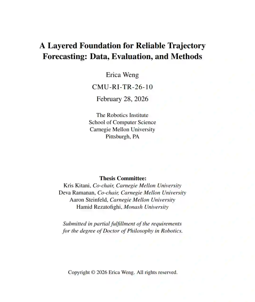 对于在有人参与的环境中运行的自主机器人系统而言,可靠的轨迹预测是一项基础性要求。这里的“可靠”意味着预测结果必须是无碰撞的、符合社交规范的,并且在常规及安全关键(Safety-critical)场景下均具备鲁棒性。尽管建模技术取得了长足进步,但现有的预测系统在面对分布偏移(Distribution shift)时经常失效,表现出社交上不可信的行为,或报告具有误导性的性能指标。领域内很大程度上将这些问题视为建模问题,因此在日益复杂的架构上投入巨大,却对模型所依赖的基础设施投入不足。本论文提出了不同的观点:可靠的轨迹预测需要将数据策展、评估设计和建模视为同等地位的工程挑战,并将其组织为一个分层堆栈,每一层都取决于其底层逻辑的健全性。优秀的方法唯有通过优秀的基准测试才能体现价值,而优秀的基准测试其意义完全取决于底层数据的质量。