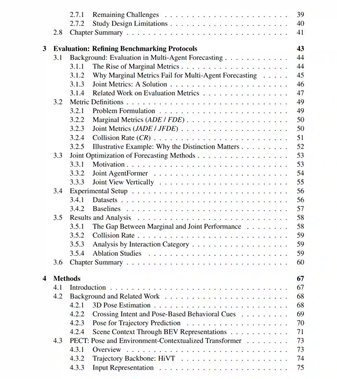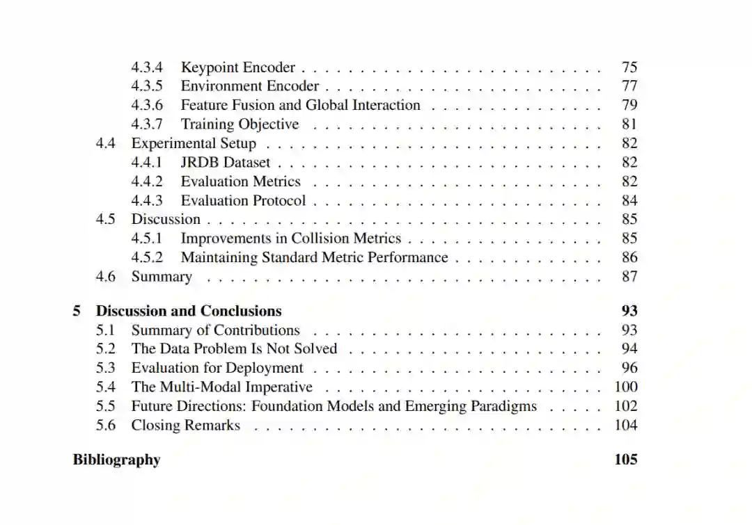 综上所述,本论文认为轨迹预测社区不应将“部署就绪性”视为单纯的建模问题,而应视其为系统性问题。数据、评估与方法深度相互依赖——忽视任何一方都会损害其他环节。通过将三者作为一个统一的堆栈处理,本研究贡献了一套框架、具体的工具以及一种构建真正符合现实世界自主决策要求的预测系统的哲学。