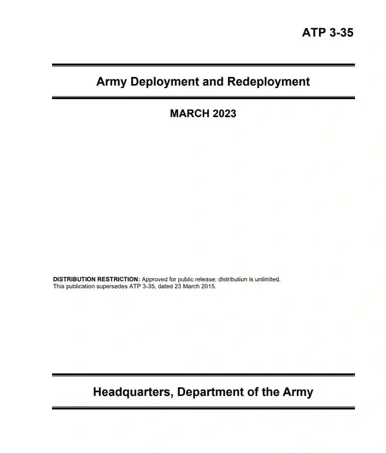 ATP3-35为陆军提供了规划、准备、执行和评估部署和再部署的权威条令。本手册是所有陆军部署和再部署条令的唯一来源。它将在既定的更高层次的陆军条令的约束下,尽可能与联合和多国条令保持一致。本出版物适用于一系列的军事行动,并支持ADP 3-0和JP 3-35。ATP3-35的主要读者是所有军人职业的成员。联合特遣部队或多国总部的陆军指挥官和参谋人员,也应参考有关军事行动范围和联合或多国部队的条令。整个陆军的培训人员和教育人员也将使用本出版物。指挥官、参谋部和下属确保他们的决定和行动符合适用的美国、国际、以及在某些情况下符合东道国的法律和法规。各级指挥官确保他们的士兵按照武装冲突法和交战规则行动。