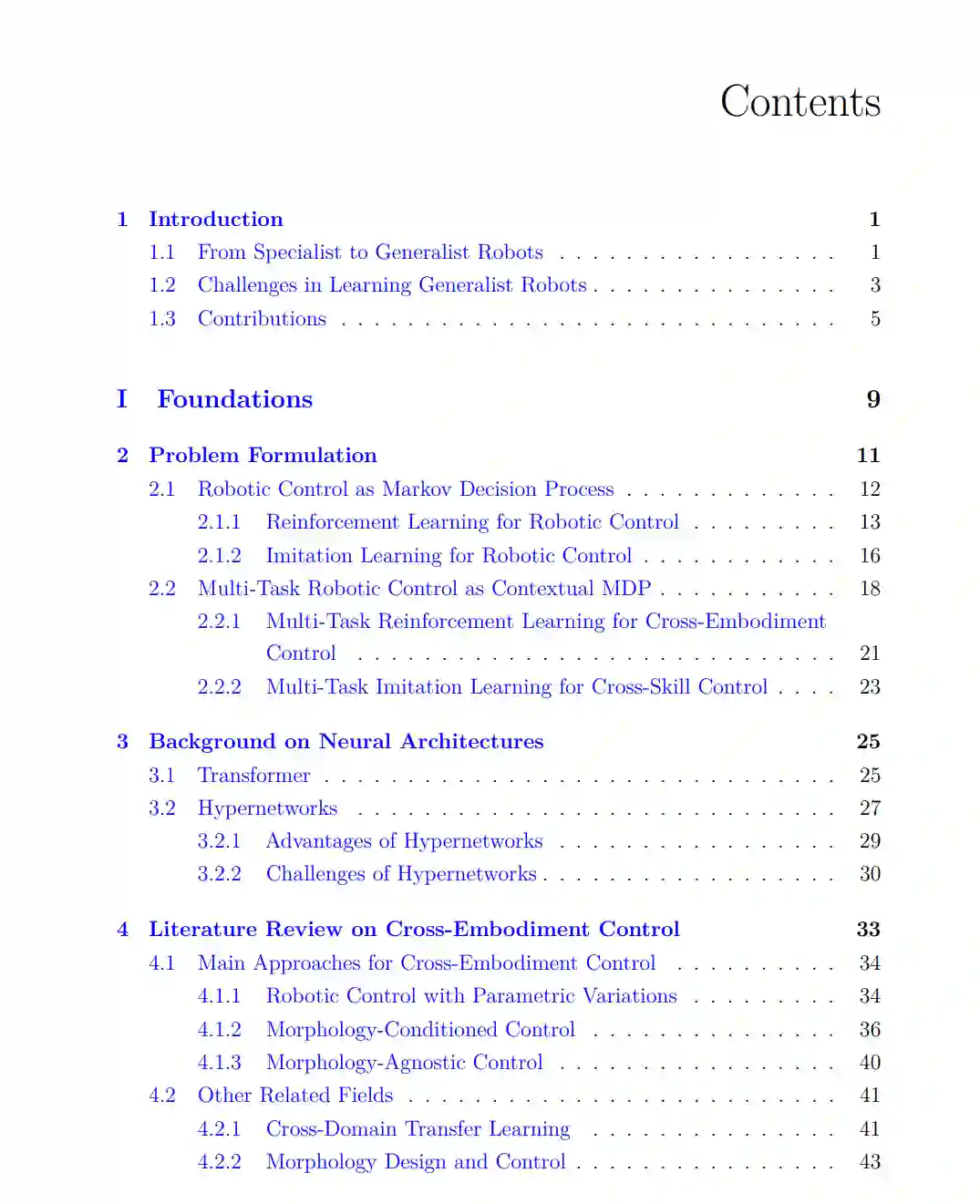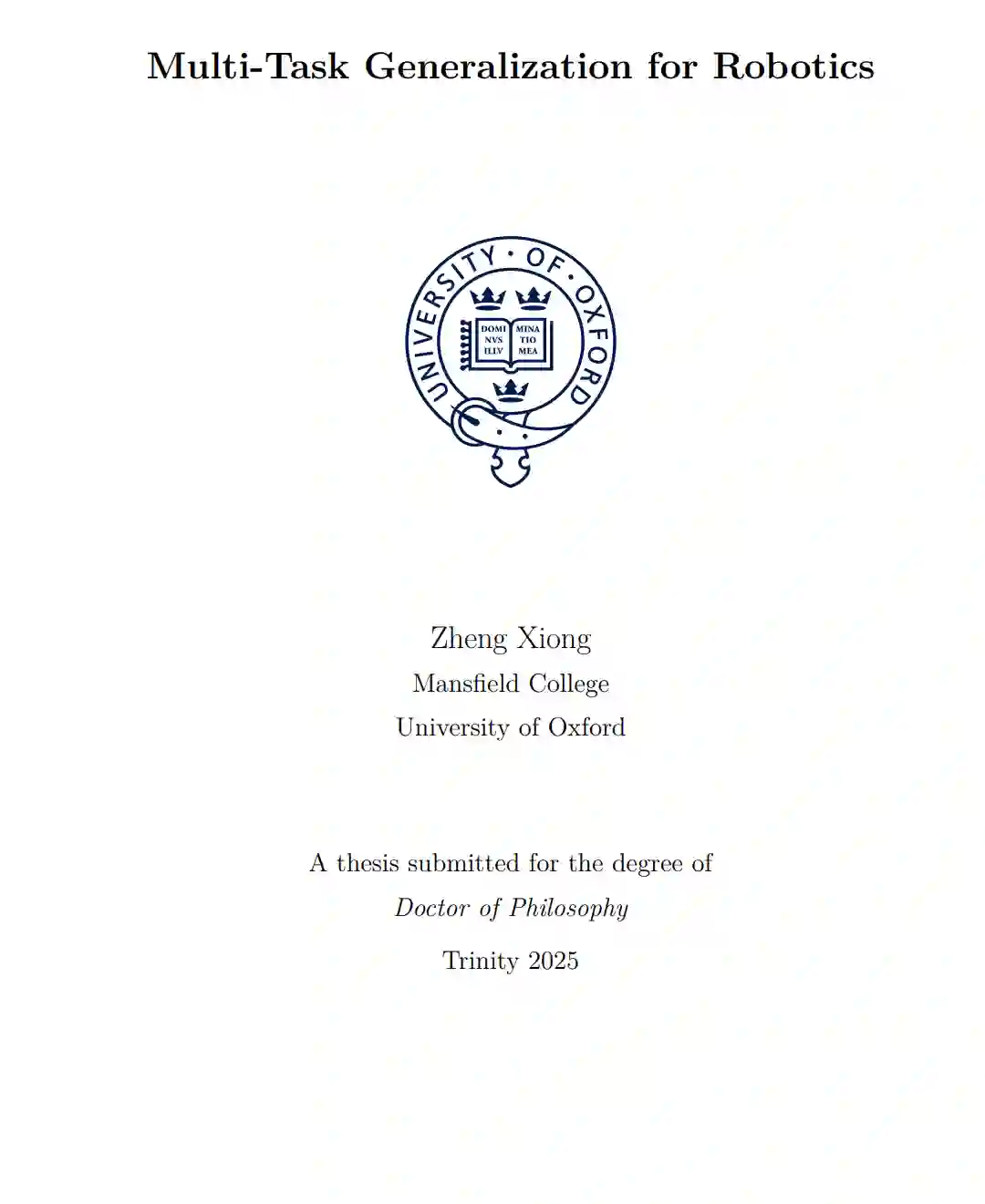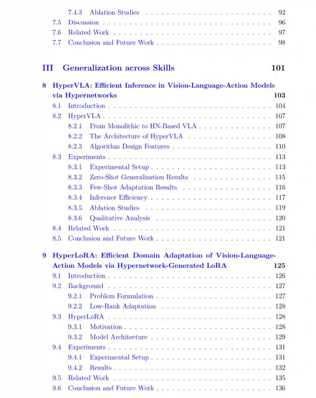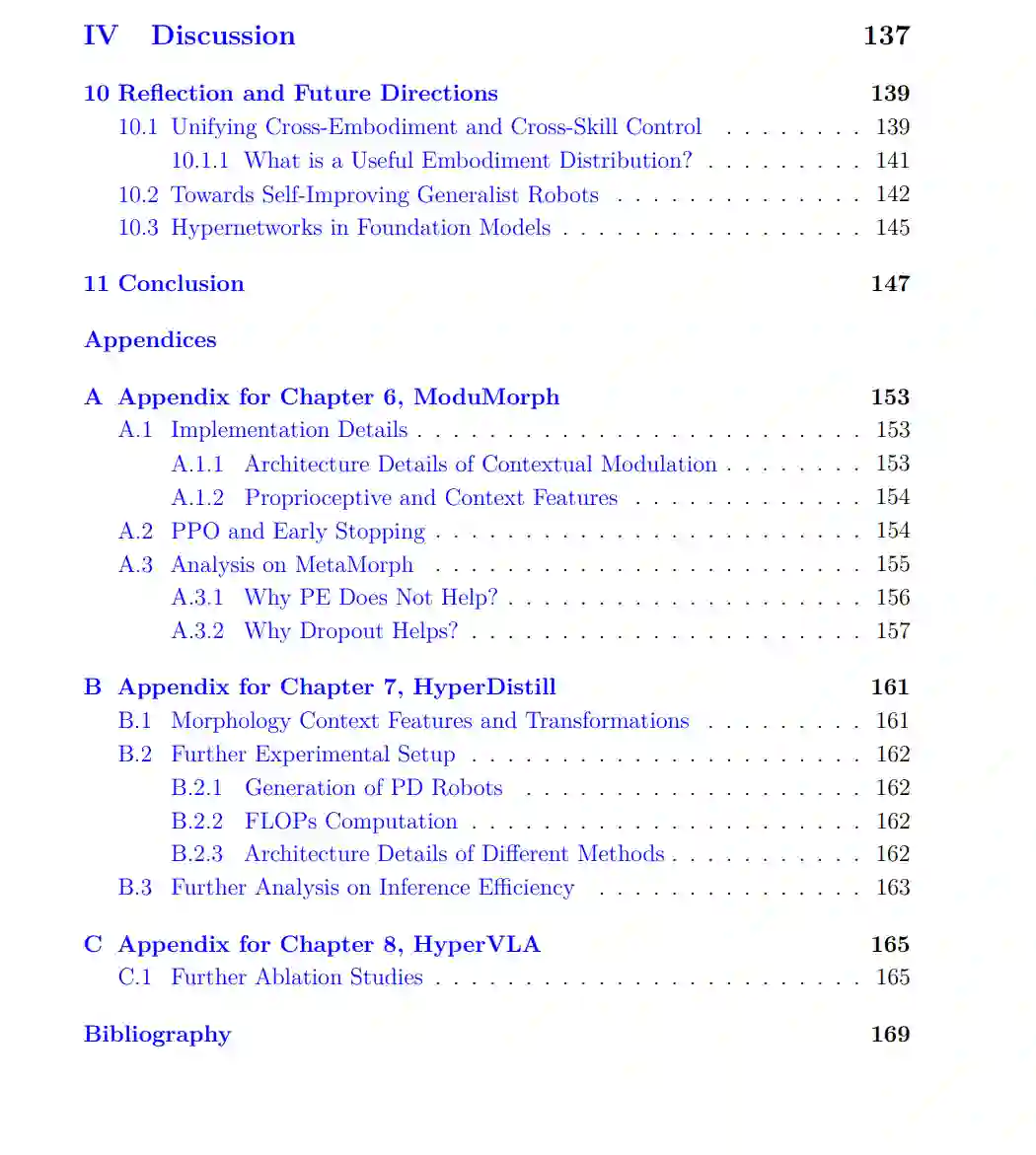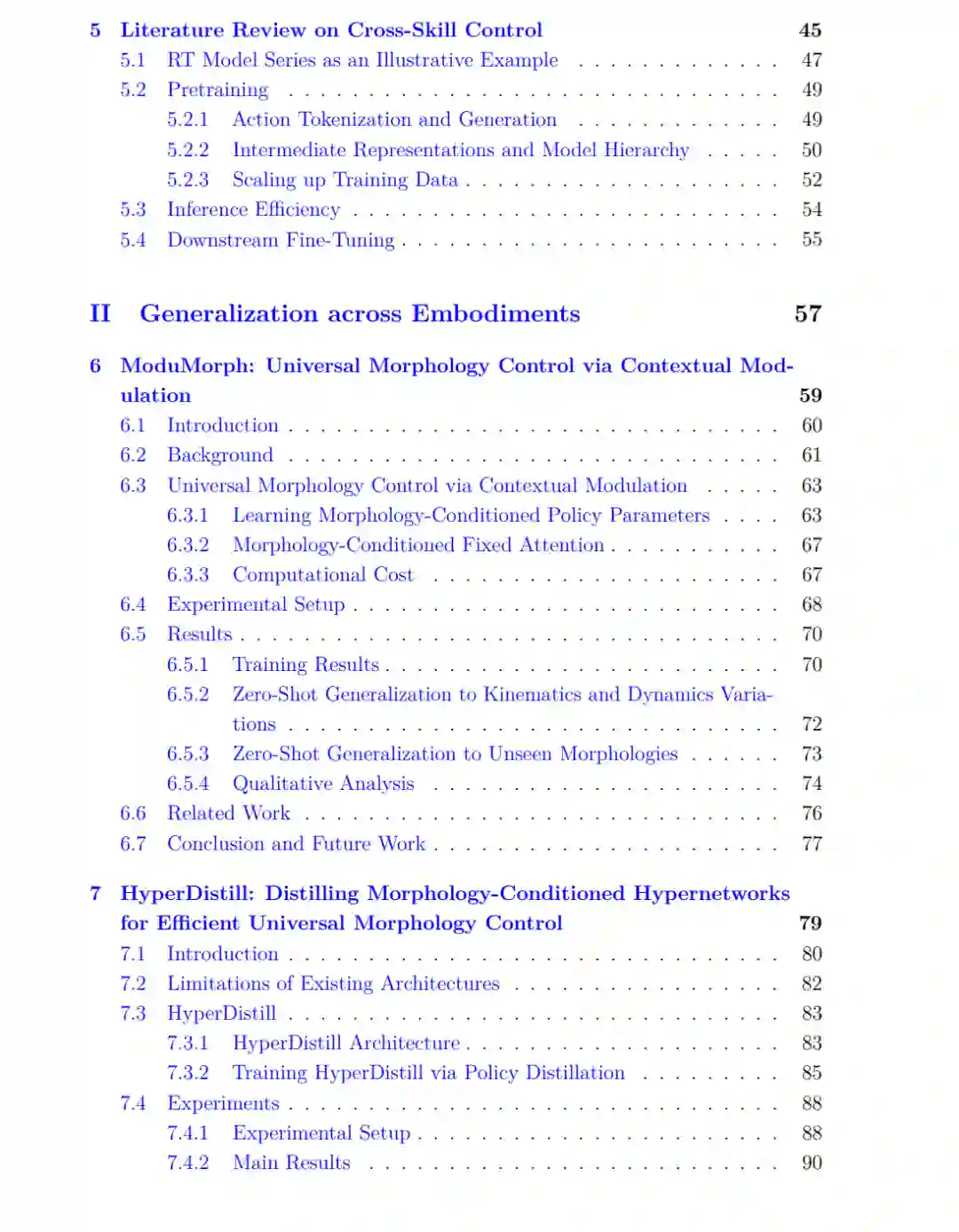 尽管遵循硬编码指令的机器人在现实世界中已得到广泛应用,但在具有不可预见变化的非结构化环境中,学习能够自主完成不同任务的智能机器人仍然是一项关键挑战。受近期基础模型在多个领域取得成功的启发,机器人学习正经历一场范式转移:从在窄任务分布上学习“专家机器人”,转向在大规模多任务数据上学习“通用机器人”,从而实现在构型、技能和场景等不同维度的更广泛泛化。 在本论文中,我们将通用机器人学习形式化为上下文马尔可夫决策过程(Contextual Markov Decision Process),并在这一统一框架下研究了跨构型和跨技能泛化这两种问题设置(第二章)。针对这两种设置,我们提出了四种创新方法,以应对以下三大挑战:模型预训练、推理效率以及高效适配。 论文第二部分关注跨构型控制。在第六章中,我们提出了 ModuMorph,这是一种基于 Transformer 的通用控制器,它通过上下文调制(Contextual Modulation)更好地建模了最优策略如何以机器人形态为条件进行演化,从而提升了预训练效果。在第七章中,我们通过知识解耦(Knowledge Decoupling)提升了通用机器人的推理效率,即:将解决不同任务所需的知识进行解耦,并在测试时仅激活一个紧凑的专家策略来解决特定任务。我们通过超网络(Hypernetworks, HNs)的分层架构实现了知识解耦,即利用超网络生成基础网络的参数,并研究了如何通过策略蒸馏成功训练超网络。我们提出的 HyperDistill 方法结合了这两个关键组件,在达到与 ModuMorph 相当性能的同时,将推理速度显著提升了两个数量级。 论文第三部分聚焦于遵循语言指令的跨技能控制。在第八章中,我们将知识解耦原则扩展到视觉-语言-动作(VLA)模型中。VLA 模型是目前语言条件控制的主流方法,但面临推理成本高昂的问题。我们提出了 HyperVLA,通过以任务上下文为条件的超网络生成紧凑策略,并探索了提升 HyperVLA 性能的若干关键算法设计选择。实验表明,HyperVLA 的性能与部分尖端(SOTA)VLA 模型相当甚至更优,同时将推理效率提升了两个数量级。最后,在第九章中,我们研究了如何以样本和计算高效的方式,将预训练的 VLA 模型适配到包含多种不同任务的新领域。为此,我们提出了 HyperLoRA,它结合了超网络强大的表达能力与参数高效微调方法 LoRA,生成任务条件的 LoRA 参数,其表现显著优于任务无关的 LoRA 微调。 综上所述,本论文的贡献显著提升了通用机器人学习中的模型预训练、推理效率及适配性能。我们希望本文提出的核心思想,如知识解耦原则以及将超网络作为构建通用智能体的关键模块,能在未来得到更广泛的应用,助力构建机器人及其他领域中更通用、更高效的基础模型。