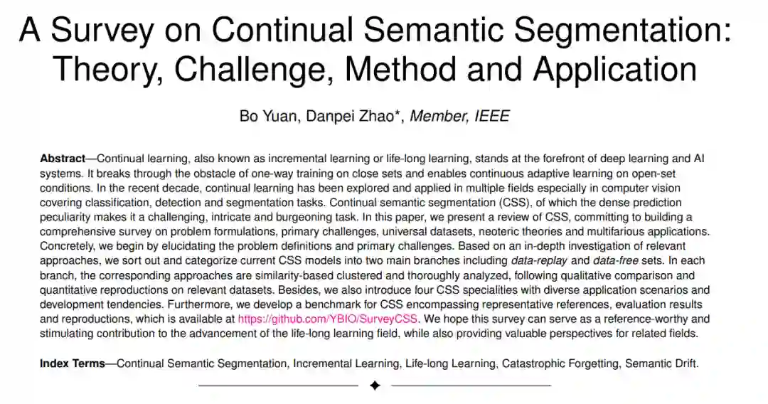 **连续学习,也称为增量学习或终身学习,**位于深度学习和AI系统的前沿。它突破了只在封闭集上的单向训练的障碍,并在开放集条件下实现了连续的自适应学习。在过去的十年中,连续学习已被探索并应用于多个领域,特别是在计算机视觉中,涵盖分类、检测和分割任务。连续语义分割(CSS)的密集预测特性使其成为一个具有挑战性、复杂性和蓬勃发展的任务。在本文中,我们对CSS进行了评述,致力于建立一个关于问题定义、主要挑战、通用数据集、新颖理论和多种应用的综合调查。具体来说,我们首先阐明了问题的定义和主要挑战。基于对相关方法的深入调查,我们将当前的CSS模型分为两个主要分支,包括数据重放和无数据集。在每个分支中,相应的方法都基于相似性进行了分类和深入分析,然后对相关数据集进行了定性比较和定量复现。此外,我们还介绍了四个CSS特点以及不同的应用场景和发展趋势。此外,我们为CSS开发了一个基准,包括代表性的参考文献、评估结果和复现,可以在https://github.com/YBIO/SurveyCSS 上找到。我们希望这次调查能为终身学习领域的发展提供有参考价值和刺激性的贡献,同时也为相关领域提供有价值的观点。