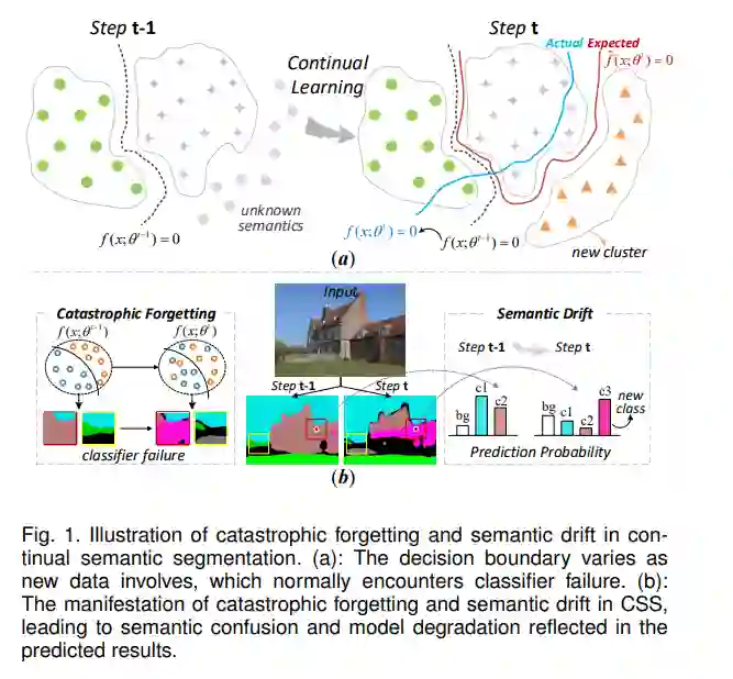 自然地,典型的模型更新涉及到在新数据上进行重新训练[10]或应用迁移学习技术[11],这引发了灾难性遗忘的问题。这个问题早在1980年代就被McCloskey等人[12]发现并讨论。也就是说,使用反向传播训练的算法会遭受严重的知识遗忘,就像人类遭受以前学到的任务的逐渐遗忘一样。此外,简单地从头开始重新训练模型可能会导致类似阿尔茨海默症的问题,其中模型由于参数更新而失去了过去的能力[11]。作为一个密集预测任务,连续语义分割(CSS)作为一个与各种实际视觉计算领域相关的有前景但具有挑战性的任务崭露头角,例如开放世界视觉解释[13]、[14]、精密医疗辅助[15]、[16]、[17]、遥感观测[18]、[19]、[20]以及自动驾驶[21]、[22]等。