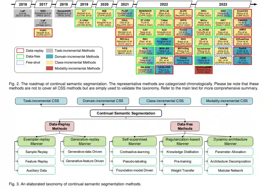 除了灾难性遗忘,CSS中的另一个关键挑战是语义漂移。这种现象指的是随着逐步学习新的类别,背景的语义内容的逐渐变化或演变。从根本上说,它源于真实背景、旧类和未来类的混合语义。如图1(a)所示,由于缺乏历史数据,模型在CL步骤中往往会遇到类别混淆和分类器偏见。此外,由于每个增量步骤只有当前的类别被标记,背景像素的语义发生漂移,因为它们的内涵变化,即已知的类别和未来的类别被混合为单一的背景类。因此,这导致了随后的分类混乱,并最终导致分类器失败。如图1(b)所示,CSS的主要挑战包括灾难性遗忘和语义漂移。它们源于旧数据的缺失和参数更新[23]、[24]、[25],导致语义混淆和模型退化。尽管CSS的一个显著前提是不能访问来自旧任务的数据,但一些研究允许将部分旧数据存储在缓存中,以增强学习新任务时的CSS效率。此外,实用的无数据和混合的少镜头CSS方法目前也在进行深入的探索。在图2中,我们展示了一系列代表性的CSS方法,展示了不同时间段的研究焦点的演变。很明显,CSS起源并在最近的十年中蓬勃发展,特别是在过去的三年中。基于历史数据的利用,CSS方法可以广泛地分类为两组。如图3所示,第一类,称为数据重放方法,涉及将部分过去的训练数据存储为示例记忆,例如[26]、[27]、[28]、[29]、[30]、[31]、[32]、[33]、[34]、[35]、[36]。第二类,称为无数据方法,包括像[37]、[38]、[39]、[40]、[41]、[42]、[43]、[44]、[45]、[46]、[47]、[48]、[49]这样的方法。这些方法利用迁移学习技巧,如知识蒸馏,来继承旧模型的能力。此外,还有许多方法的子类,它们在表1中总结,在第4节中详细说明。关于应用场景,CSS方法还可以分为四种任务,这些任务在第2.2节中详细讨论。