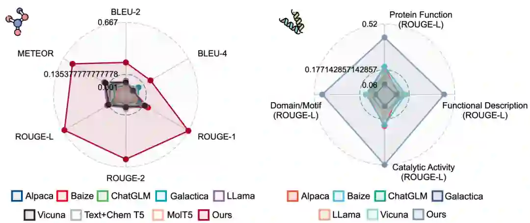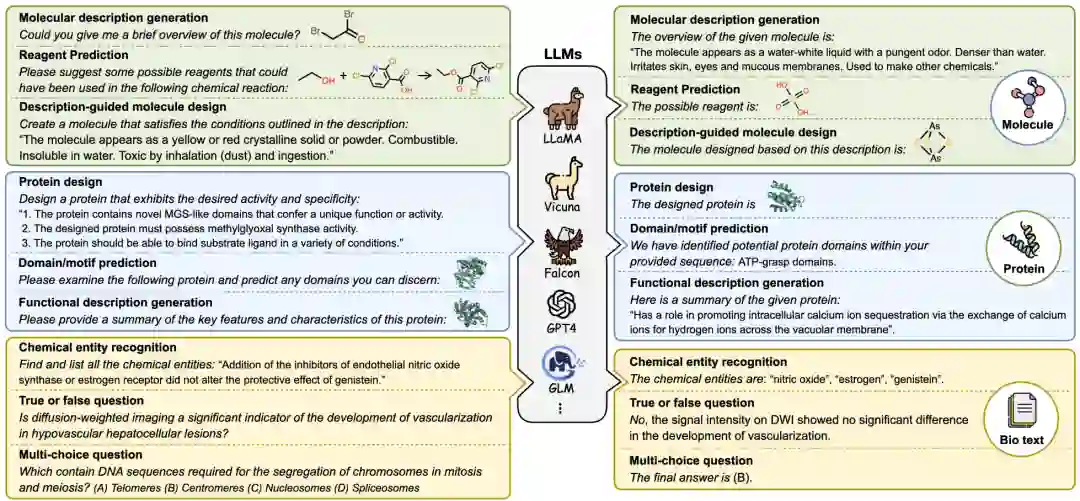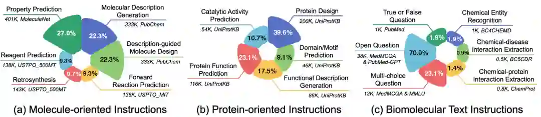 小分子指令:深度探索小分子的固有属性与行为,研究化学反应和分子设计的核心挑战。理解和预测小分子的化学特性,优化分子设计,提高化学反应预测的准确性和效率。其目标是在化学和药物设计领域加速药物的研发进程,同时降低研发成本。 * 蛋白质指令:主要解决蛋白质设计和功能相关的问题。旨在预测蛋白质结构域、功能及活性,通过文本指令推动蛋白质设计。对于疾病的诊断、治疗以及新药的研发工作具有一定的价值。 * 生物文本指令:侧重于生物信息学和化学信息学领域的自然语言处理任务。旨在从生物医学文献中提取和解析关键信息,支持研究人员快速获取知识、便于进行查询。