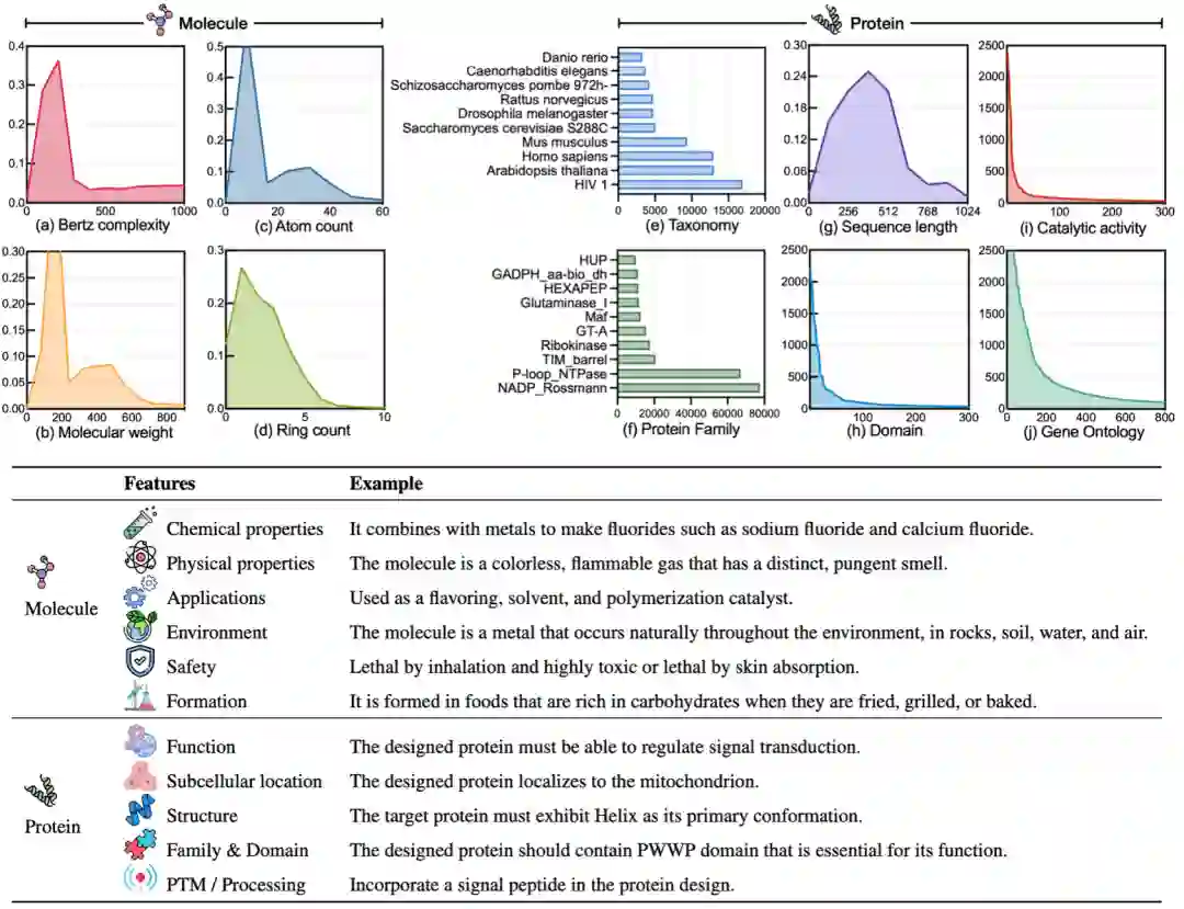 图(a-d)揭示了分子的多维特征。Bertz复杂度是评估分子复杂度的关键指标。分子量反映了分子的大小和复杂性,对众多化学反应具有决定性影响。原子计数揭示了分子的规模和复杂度,进而影响其稳定性和反应性。环计数则提供了结构复杂度和潜在稳定性的视角,对理解化学反应性和生物活性潜力至关重要。图(e-j)探究了蛋白质的特性。图(e-g)体现了蛋白质序列长度的不同分布。根据NCBI分类,这些蛋白质覆盖了丰富的物种和实验菌株,包括13,563个蛋白质家族和643个超家族。图(h-j)关注功能特征,如结构域、基因本体和催化活性的注释。这些数据表现出显著的长尾分布,凸显了推断特定蛋白质功能的挑战,尤其是那些罕见功能的蛋白质。 * 如表格所示,分子设计和蛋白质设计的文本描述提供了多维度的视角,涵盖从基本属性到特定应用场景的广泛特性。