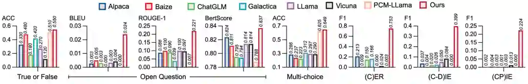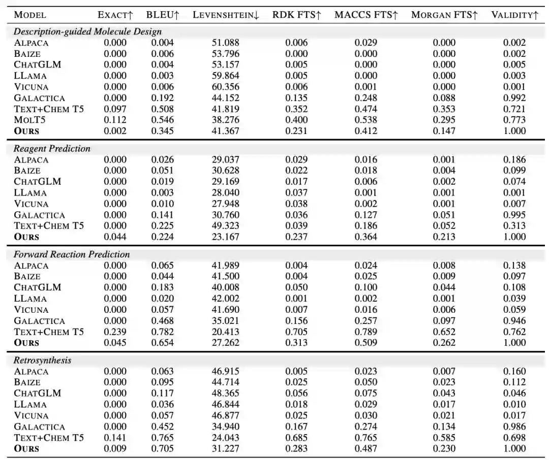 为评估Mol-Instructions对大型语言模型(LLMs)在理解和预测生物分子方面的助益,本文对LLaMA-7B模型进行了指令微调,并从多个角度进行了定量实验分析。实验结果显示,经Mol-Instructions微调的LLM在多种任务上的表现超越了其他大型模型,证明了Mol-Instructions在提升LLMs处理生物分子信息能力方面的关键作用。然而,由于轻量微调过程的局限性,经过微调的LLM在分子生成任务上的表现并未超越现有的专用小型模型。这反映了LLM在追求广泛任务处理能力时,可能会牺牲掉某些专用小模型的专业性。