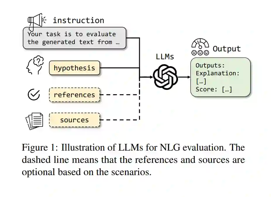 大型语言模型(LLMs)涌现的能力为基于LLM的NLG评估提供了有前景的途径,例如Chain-of-Thought(CoT)(Wei et al., 2022b)、零次学习指令跟随(Wei et al., 2022a)、更好地与人类偏好相一致(Ouyang et al., 2022)等。这些特性使LLMs成为评估NLG输出的有力工具,与传统方法相比提供了更为复杂和更好地与人类一致的评估(Liu et al., 2023c;Kocmi and Federmann, 2023;Fu et al., 2023)。例如,LLMs可以生成合理的解释来支持最终评分(Xu et al., 2023),而利用人类反馈的强化学习(RLHF)可以使LLMs的偏好更好地与人类一致(Ouyang et al., 2022;Zheng et al., 2023)。如图1所示,这些方法的关键策略涉及指示LLMs使用提示来从不同方面评估生成的文本,无论是否有参考资料和来源。然而,众多基于LLM的NLG评估方法,针对不同的任务和目标,缺乏统一的概述。