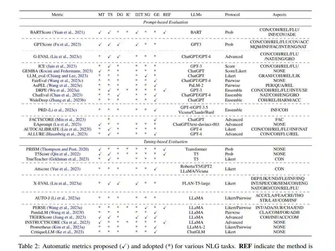 在大型语言模型(LLMs)迅速发展的背景下,越来越多的研究将重点放在利用这些模型作为NLG任务的评估者。这种关注特别源于LLMs的高容量生成能力,导致出现了使用它们来对NLG文本进行质量评估的工作——我们将这种范式称为生成性评估。这一类别大致分为基于提示的评估和基于微调的评估,其核心在于LLM评估者的参数是否需要微调。基于提示的评估通常涉及使用精心设计的提示指导强大的基础LLMs来评估生成的文本。另一方面,基于微调的评估依赖于专门为NLG评估校准的开源LLMs。这两种方法都适用于不同的评估协议,用于衡量生成文本的质量。