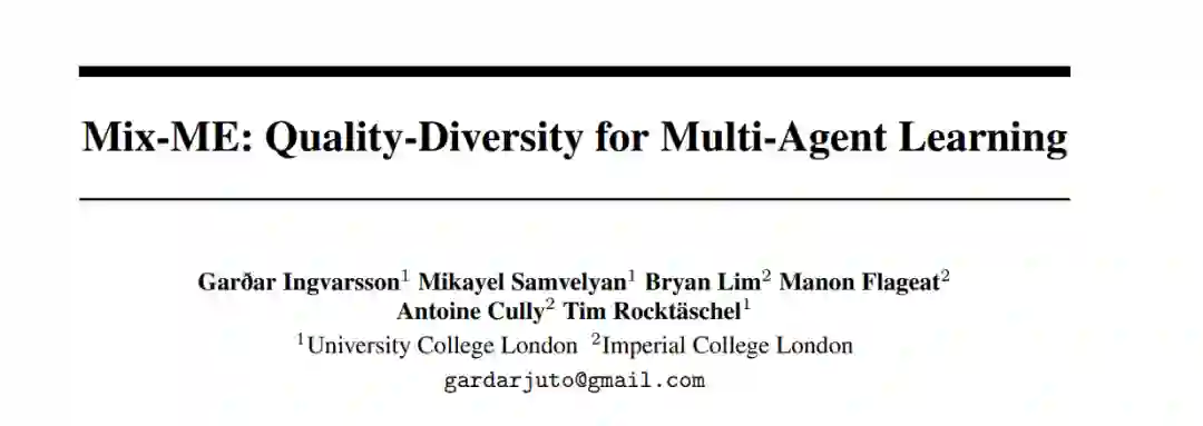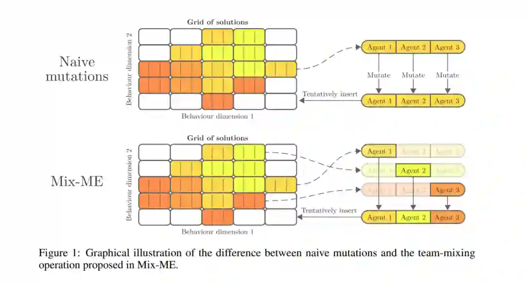 在许多实际系统中,例如自适应机器人技术,实现单一、优化的解决方案可能是不够的。相反,为适应各种不同的环境和要求,通常需要一组多样化的高性能解决方案。这就是质量-多样性(QD)的领域,其目标是发现一系列高性能的解决方案,每一个都有它们自己独特的特性。近期,QD方法在很多领域都取得了成功,包括机器人技术,在这个领域,它们被用来发现能适应损伤的行走控制器。然而,大多数现有的工作都集中在单一代理设置上,尽管许多感兴趣的任务都是多代理的。为此,我们介绍了Mix-ME,这是一种新的多代理版本的受欢迎的MAP-Elites算法,它通过混合来自不同团队的代理来形成新的解决方案,使用类似交叉的操作符。我们评估了在部分可观察的连续控制任务上提出的方法。我们的评估显示,通过Mix-ME获得的这些多代理版本不仅能与单代理基线竞争,而且在部分可观察的多代理设置下常常胜过它们。