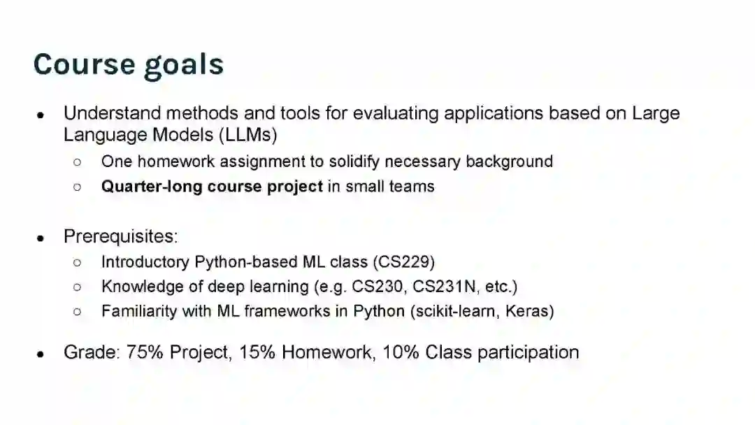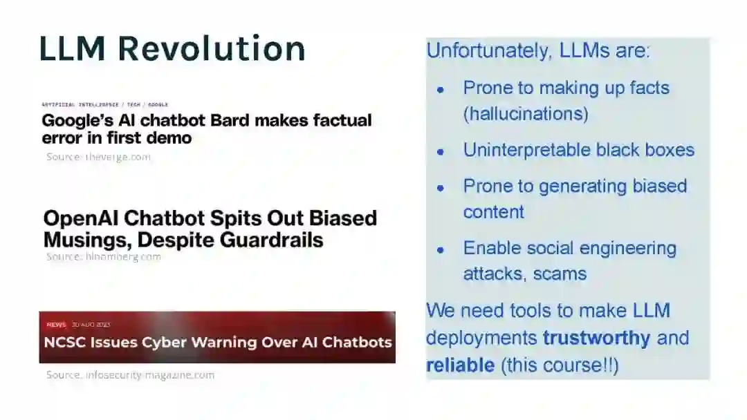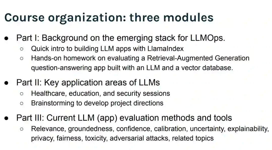 大型语言模型(LLMs)及其驱动的应用近期受到了巨大的关注,尤其是自2022年11月发布ChatGPT以来。此课程将为您提供介绍最先进的方法和工具,使LLMs - 模型和应用 - 更为可信。课程将被组织成三个模块:第一部分将为LLMOps的新兴技术栈提供背景知识。学生们将快速了解如何使用LlamaIndex构建LLM应用,并完成一个关于评估使用LLM和向量数据库构建的检索增强生成问题回答应用的实践作业。第二部分将涵盖LLMs的主要应用领域,特别是医疗、教育和安全领域。我们将交替进行演示与关于项目方向的头脑风暴。第三部分将涵盖最先进的LLM(应用)评估方法和工具。我们将涵盖从相关性、基础性、信心、校准、不确定性、可解释性、隐私、公平性、有害性、对抗性攻击及相关主题的一系列话题。学生将对评估LLM应用的一套方法和工具有所了解。学生们将完成一项家庭作业以获得必要的背景知识。主要的努力将放在为期一个季度的课程项目上。
