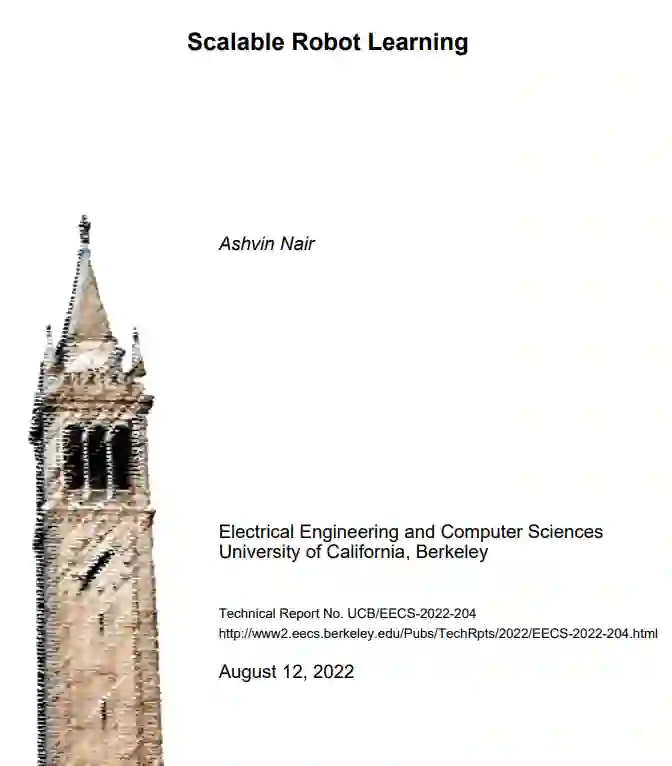 对于机器人来说,要在现实世界的非结构化环境中执行任务,他们必须能够以一般的方式被赋予一个期望的目标,并且在机器人还不知道如何完成的情况下,学会快速地执行期望的任务。在这篇论文中,我们探索了深度强化学习作为一种解决方案,通过两个主要主题来实现可扩展的基于学习的真实世界机器人的愿景:从先验数据加速强化学习和自监督RL。从先验数据或先验知识加速RL对于使强化学习算法具有足够的样本效率来直接运行在现实世界中是非常重要的。我们讨论了利用人类演示来加速强化学习,使用人类设计的剩余控制器与工业插入任务的强化学习相结合,以及离线强化学习的算法,也可以受益于少量的在线微调。同时,虽然强化学习算法的样本效率是一个备受赞赏的问题,但围绕可以从丰富的观察(如图像)中学习的智能体产生了额外的问题:特别是奖励监督和自主收集数据。我们通过一个生成模型来讨论自监督的RL,通过目标达成,让智能体评估他们自己在达成目标方面的成功,并自主提出和练习技能。在最后一部分,我们考虑将线下政策学习与自我监督练习相结合,让机器人在新的环境中练习和完善技能。这些指示使机器人能够监督自己的数据收集,从交互中学习复杂和一般的操作技能。