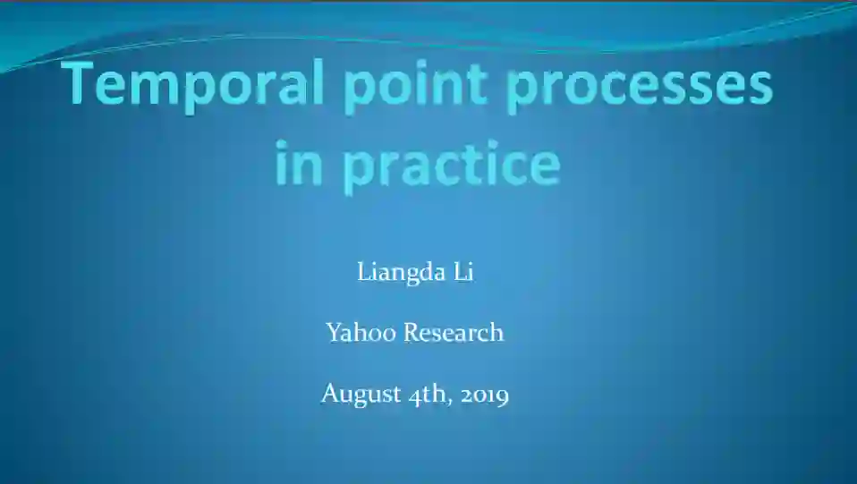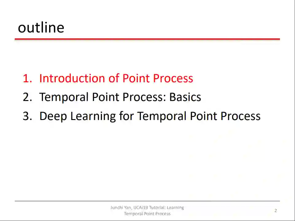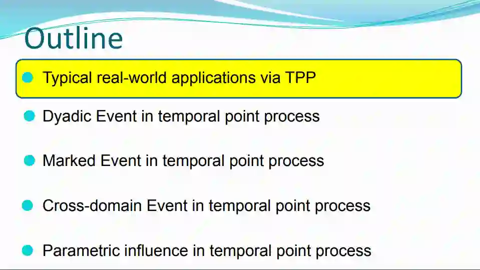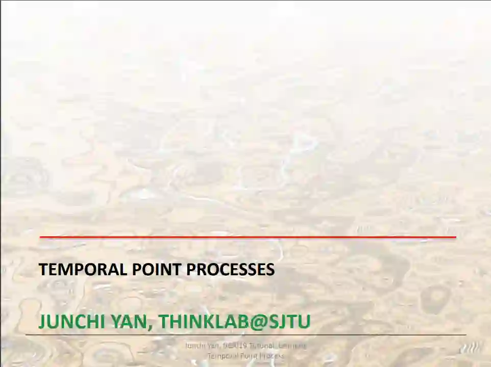 在本教程中,我将首先对时间点过程的预备知识做一个基本的介绍,并通过几个应用实例回顾一些流行的和经典的表单。还将描述基于贝叶斯形式的学习。然后我将介绍点过程学习的最新进展,包括TPP的深度学习和强化学习。最后,我将展示一些新的场景,例如应用TPP模型时的缺失和删失观测,并讨论未来的方向,以便于在时间点过程中的进一步研究。