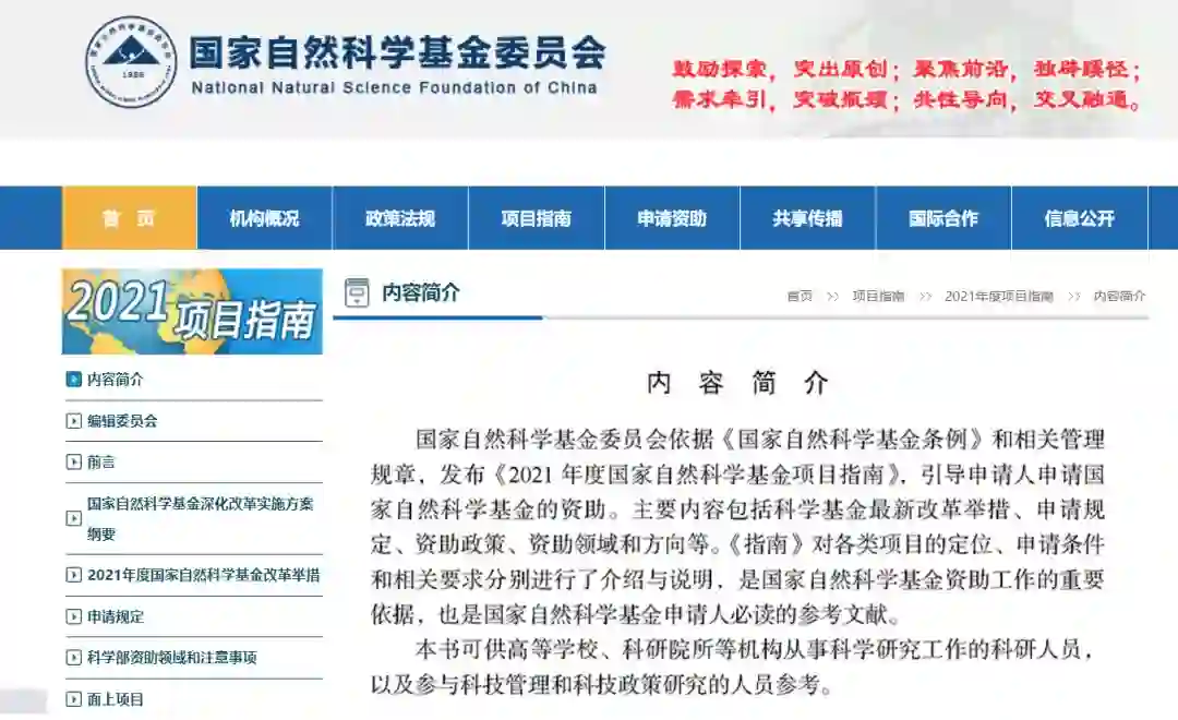 国家自然科学基金委员会依据《国家自然科学基金条例》和相关管理规章,发布《2021年度国家自然科学基金项目指南》,引导申请人申请国家自然科学基金的资助。主要内容包括科学基金最新改革举措、申请规定、资助政策、资助领域和方向等。《指南》对各类项目的定位、申请条件和相关要求分别进行了介绍与说明,是国家自然科学基金资助工作的重要依据,也是国家自然科学基金申请人必读的参考文献。