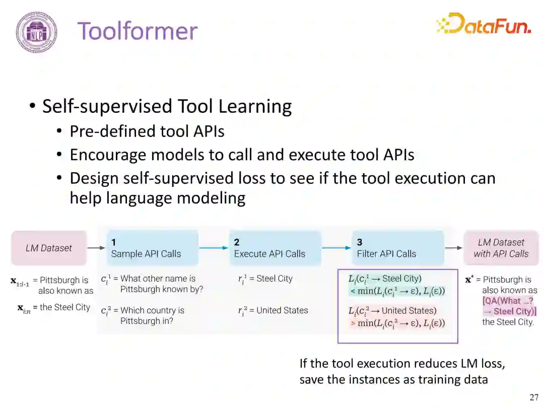构建一个自监督的 Loss 函数,让模型来决定哪些 API 的调用有助于它的语言建模的预测 **步骤:******给定一个纯文本数据集,构建出一个带有 API 调用的数据集,然后在此数据集上做微调