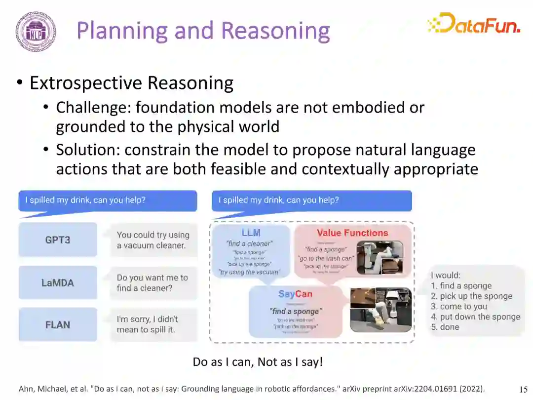 大模型默认解决方案,不断根据每一步的成败以及环境和人类的反馈,动态跟进该规划,直至整个流程完成。**挑战:**模型的自省式推理生成静态规划 Plan 存在一定问题,最优的方案是模型可以很好地在下游任务中落地。文章 Ahn, Michael, et al. "Do as i can, not as i say: Grounding language in robotic affordances." arXiv preprint arXiv:2204.01691 (2022) 提到:不是模型想做什么就做什么,而是让模型知道当前场景下能做什么才去做什么。方案1: