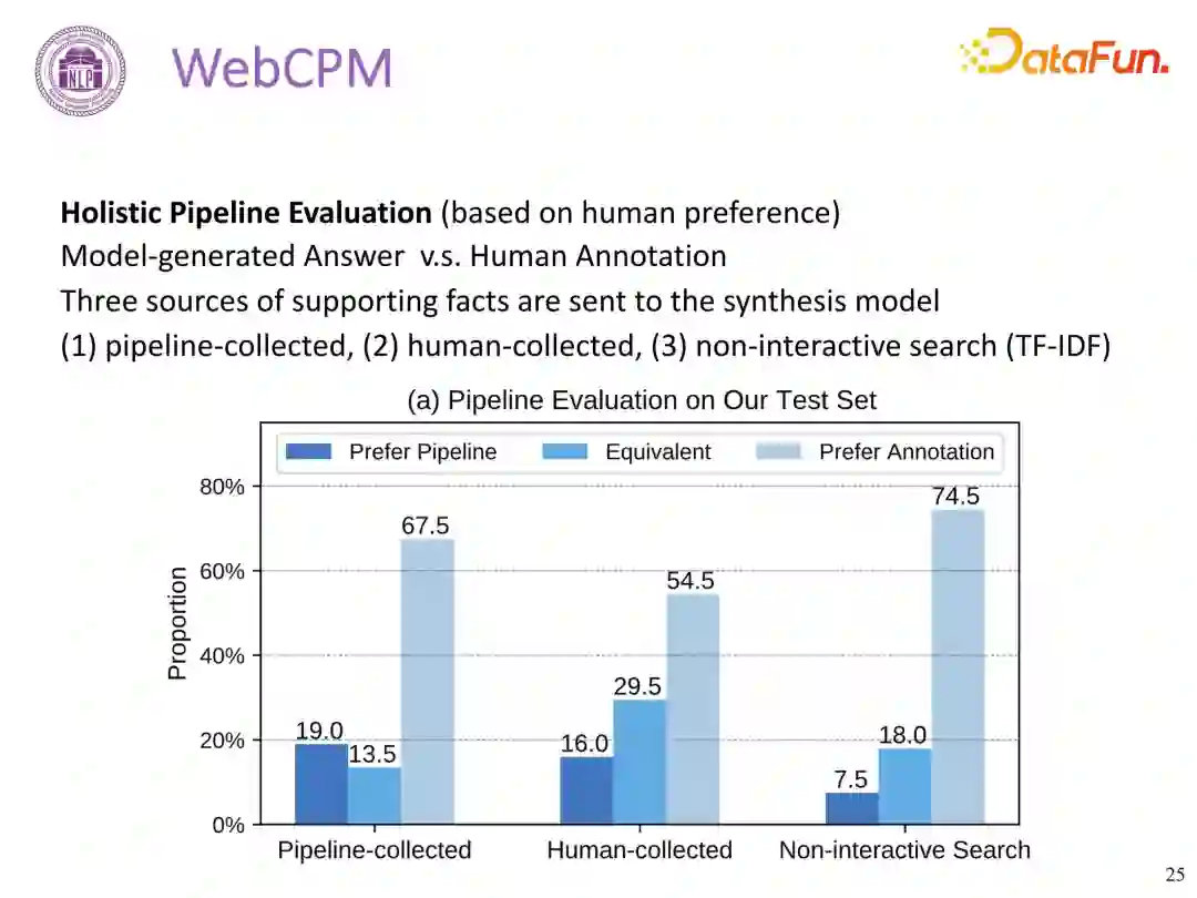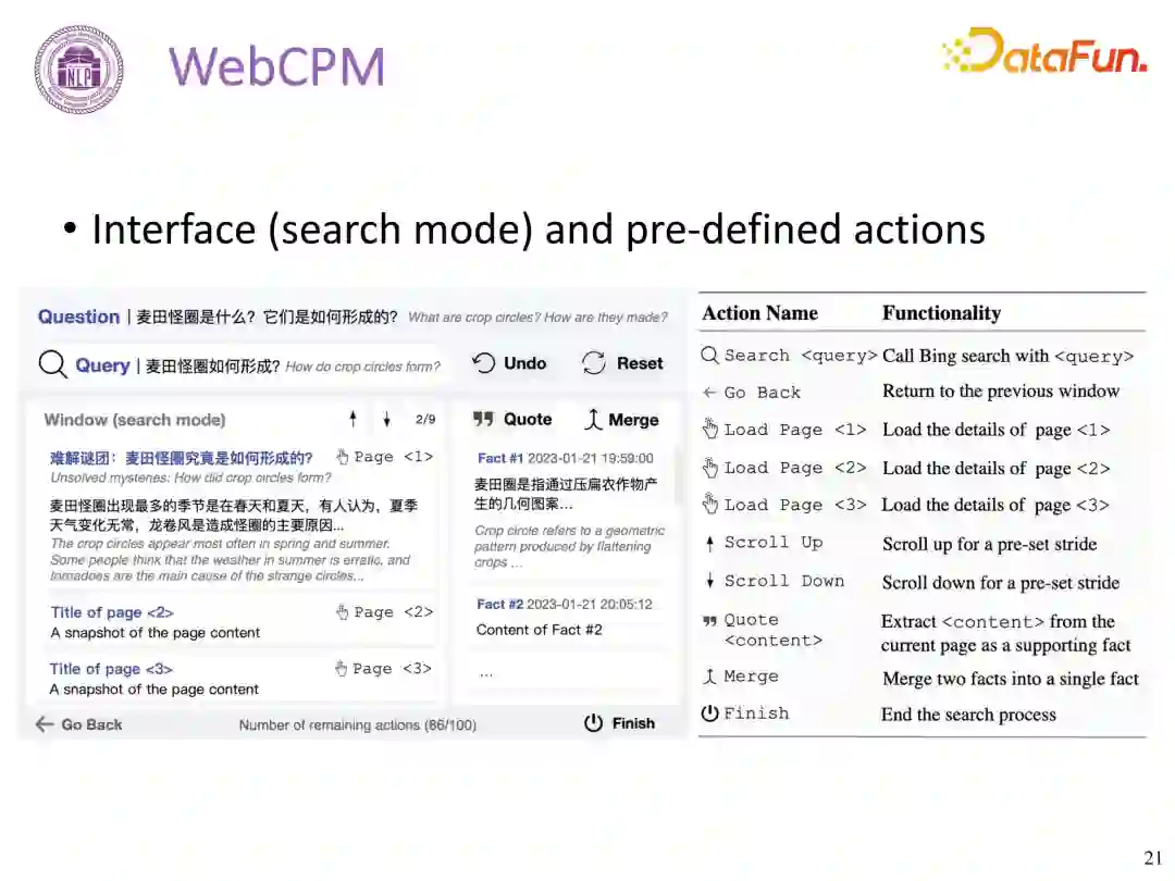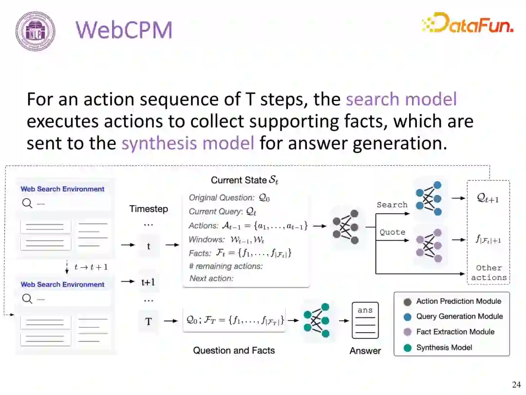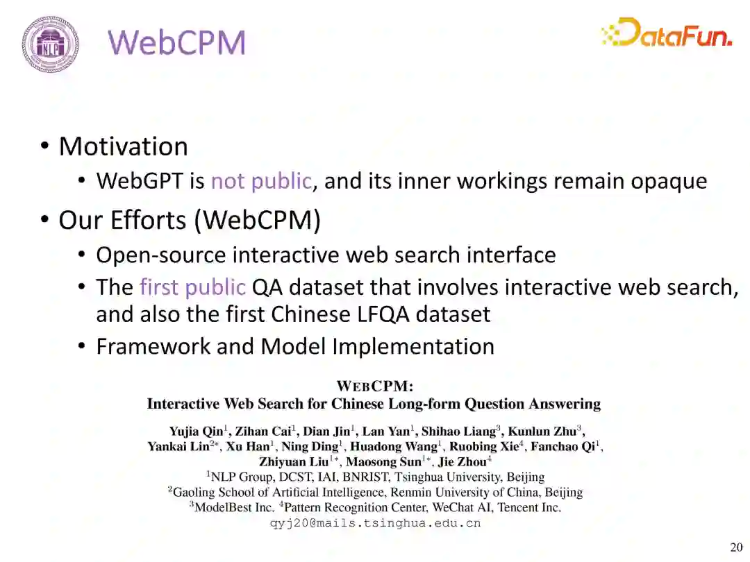 WebCPM 工作是在 ChatGPT3.5 发布之前,当时的基础模型与 ChatGPT 还是有一定的差距,随着 CPM 模型的改进,当前内部测试发现可以远超人类水平。 3. 其他工作