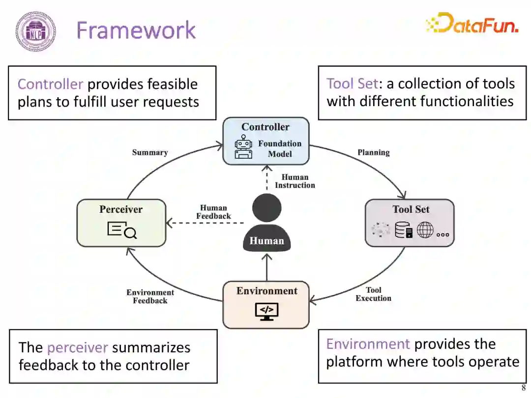 一个通用的工具学习框架,类似强化学习 MDP 的架构,包含人类用户角色和四个关键组成部分:工具集、控制器、感知器和环境。