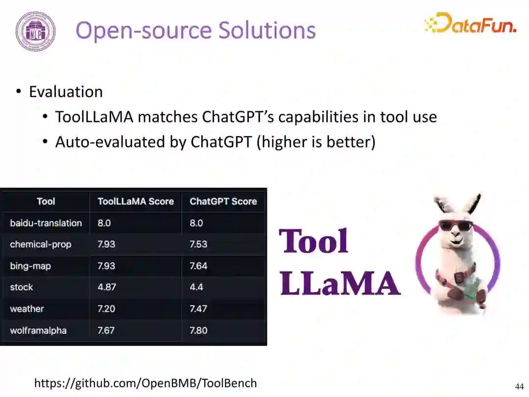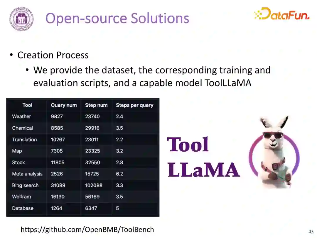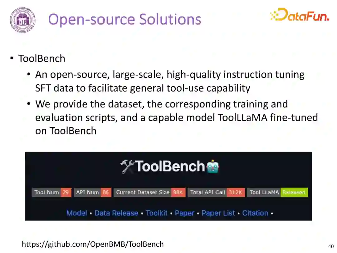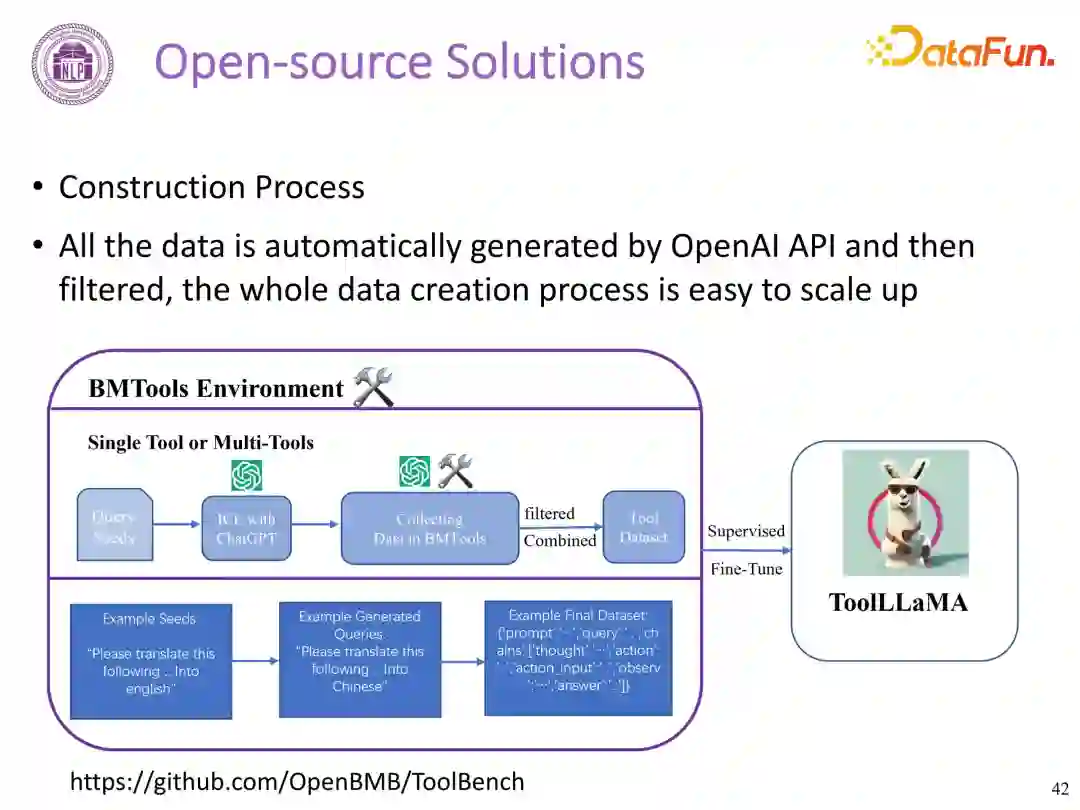 ToolBench 仓库中提供了相关数据集、训练和评估脚本,以及在 ToolBench 上微调的功能模型 ToolLLaMA。仓库中包含 31.2 万次真实 API 调用得到的 9800 条数据。