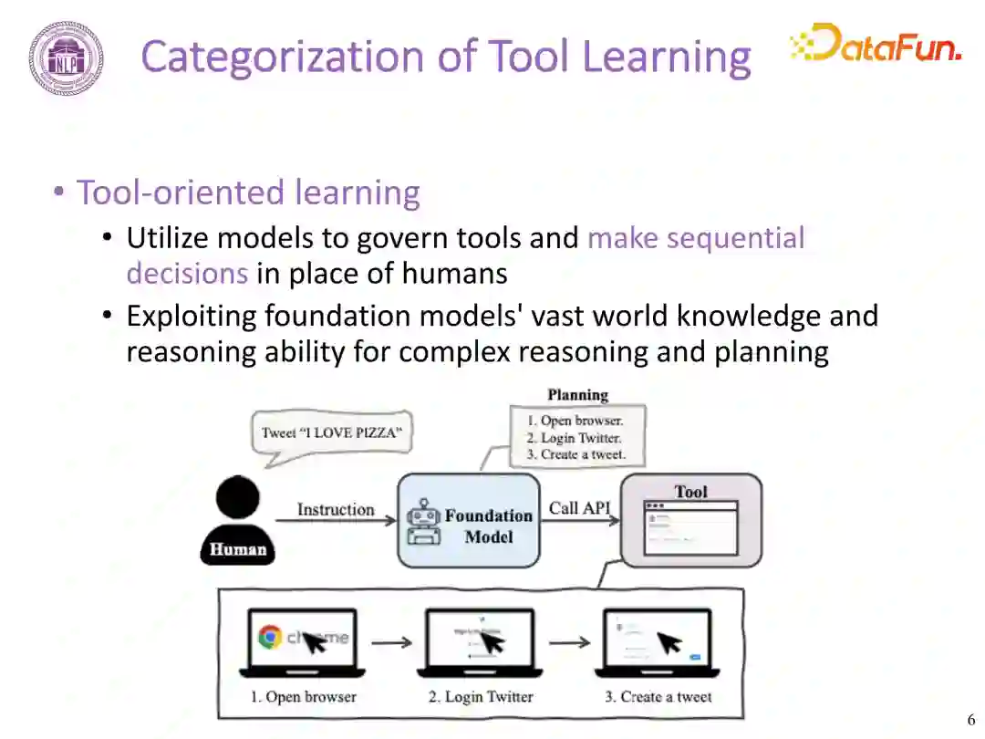 工具导向学习,将学习过程重点从增强模型性能转向工具执行本身。这一范式关注开发能够代替人类控制工具并进行序列决策的模型。利用基础模型丰富的世界知识和复杂推理与规划的能力,让模型管理工具,充当整个工具智能的大脑,使其可代替人类高效执行一系列的序列决策。如人类让大模型到 Twitter 上发一条推特,大模型会先规划,将目标分解为多个子目标,如打开浏览器,登录推特,发送推特。每个子目标的完成可能会去调用 API,逐步完成所有子目标,直到完成最终的目标。02