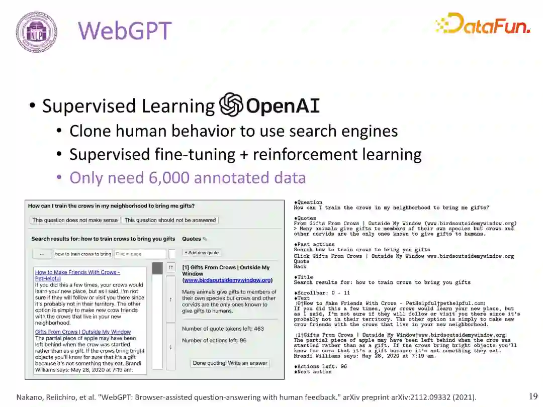 2021 年 12 月 WebGPT 的发布标志着基于网页搜索的问答新范式的诞生,该篇工作(Nakano, Reiichiro, et al. "WebGPT: Browser-assisted question-answering with human feedback." arXiv preprint arXiv:2112.09332 (2021)) 可以算是工具学习领域最早期的工作,其做法为基于人类记录的大量搜索引擎使用的行为数据进行有监督 Fine-Tune 和强化学习,使得大模型学会使用搜索引擎。该文证明只需 6000 条数据就可让模型很好地学会如何使用搜索引擎,且能力会超越人类专家。