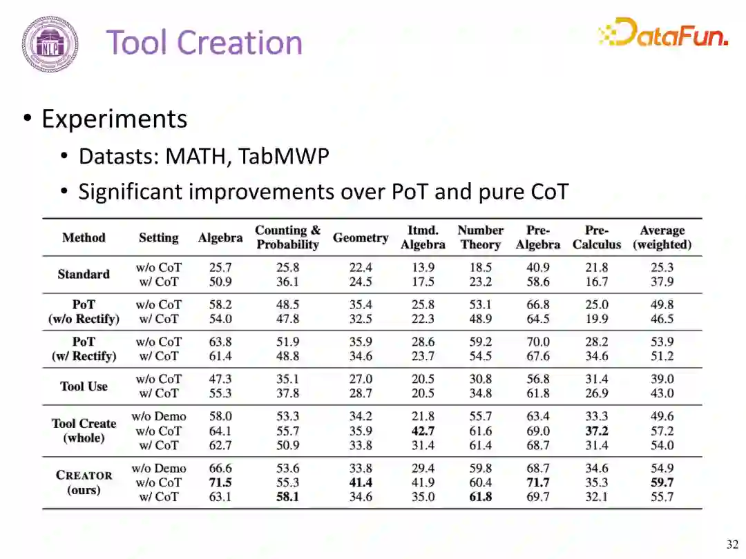 通过实验发现增加工具生成,使得解决实际任务的能力增强,相较 PoT 和 CoT 都有显著的提升。