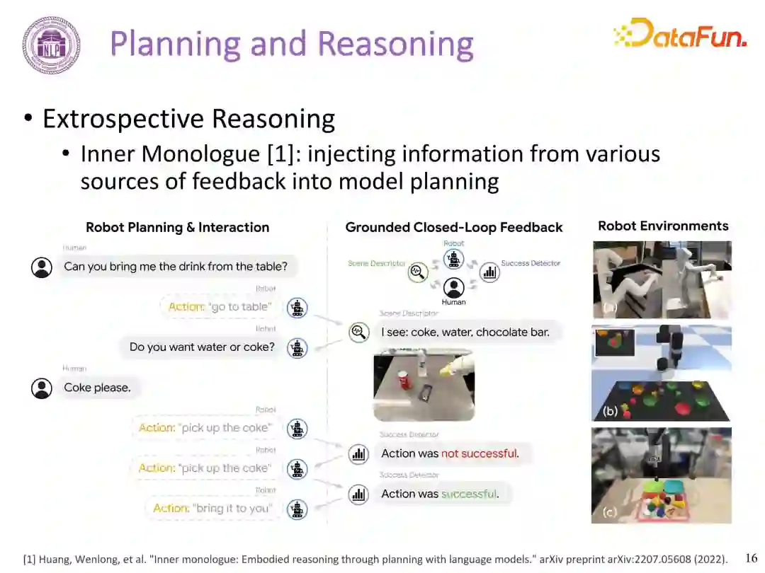 上篇论文通过设定 value function 限定了模型在每种场景下可做的任务,模型在某一场景下,只在上述的限制任务集合中进行选择,可以保证模型的可执行。方案2:Inner Monologue 这篇工作将不同来源的反馈信息注入到模型规划中,例如静态反馈——每次执行后环境的变化,动态反馈——人主动告知该任务是否成功等。基于环境反馈的模型能更好地进行推理和规划,达到更好的效果。
