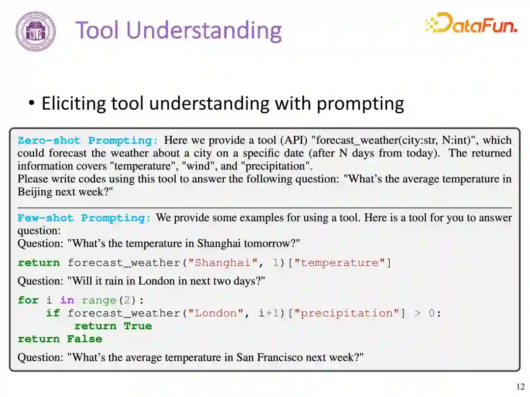 不仅给出任务描述性提示,还要直接展示少量(few-shot)的使用工具的示例,模型通过模拟人类的行为,理解如何使用工具。如下图,Few-shot Prompting 给出了调用 API 的示例(如何回答问题—明天上海的温度),然后再让大模型利用 API 去解决问题。**优点:利用少量示例帮助模型理解任务,提高了模型的性能。比 Zero-shot Prompting 更灵活,可以应对更多种类的任务。**缺点:需要选择有代表性的示例,这需要一定的专业知识和经验。对于一些复杂的任务,可能需要更多的示例才能达到满意的性能。