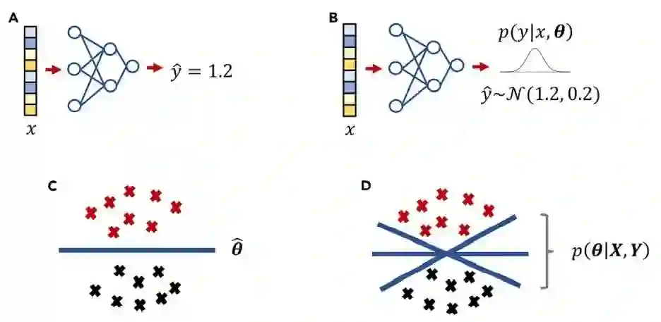 图3 传统神经网络与贝叶斯神经网络的比较 传统神经网络的输出和参数是确定性值(A和C),而在贝叶斯神经网络中它们是分布(B和D)。