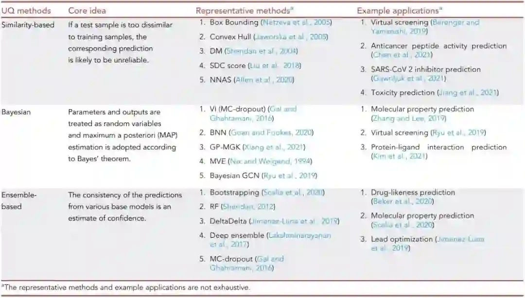 在化学界,长期以来一直存在一些类似于不确定性量化的概念,其中最常见的是QSAR模型的适用性域(applicability domain,AD)。 UQ和AD具有相同的目的:帮助研究人员确定样本的预测结果是否可靠。与UQ相比,传统的AD定义方法更面向输入,一般考虑样本的特征空间或子特征空间,较少考虑模型本身的结构。相应地,UQ的概念更广泛,可以指用于确定预测是否可靠的所有方法。因此,UQ 在概念上涵盖了AD定义方法。在这里,一些经典的AD定义方法被归类为基于相似性的UQ方法,并将在“基于相似性的方法”一节中介绍。 本文将回顾UQ在当前药物设计和发现范式中的概念、方法和应用,更加关注UQ的具体应用案例,并解释所用方法的基本原理,希望能为在药物设计中部署可信的AI模型提供见解和实践指导。 药物发现不确定性的来源 根据不同的来源,不确定性大致可分为三类:近似的(approximation)不确定性、偶然的(aleatoric)不确定性和认识论的不确定性(epistemic uncertainties)。 近似的不确定性解释了由于简单模型无法拟合复杂数据而导致的误差,例如线性模型拟合正弦曲线所产生的误差。 偶然的(aleatoric)不确定性(源自拉丁语alea,意思是掷骰子)描述了待建模的数据的内在随机性(噪声)。这是数据的固有属性,无法通过收集更多的训练数据来减少这种不确定性。在药物发现项目中,数据噪声总是来自于不同的实验测量,这些测量结果因两个主要误差源而变得复杂:系统误差和随机误差。认识论的不确定性(epistemic uncertainties,源自希腊语Greek episteme,意为认识)代表了与样本空间某些区域(例如,模型AD之外的化学空间)缺乏训练模型知识相关的错误。 不确定性量化方法 大量的UQ方法已被部署在药物发现项目中。本文提出了一种新的分类方法来跟踪各种UQ方法的发展路径。通过关注这些UQ方法的理论基础,将其分为三种类型:基于相似性的方法、贝叶斯方法和基于集成的方法。本文总结了他们的核心思想、代表性方法和示例应用 (表1)。以下各节将介绍这些 UQ方法和相关概念。 表1 不确定性量化方法的总结