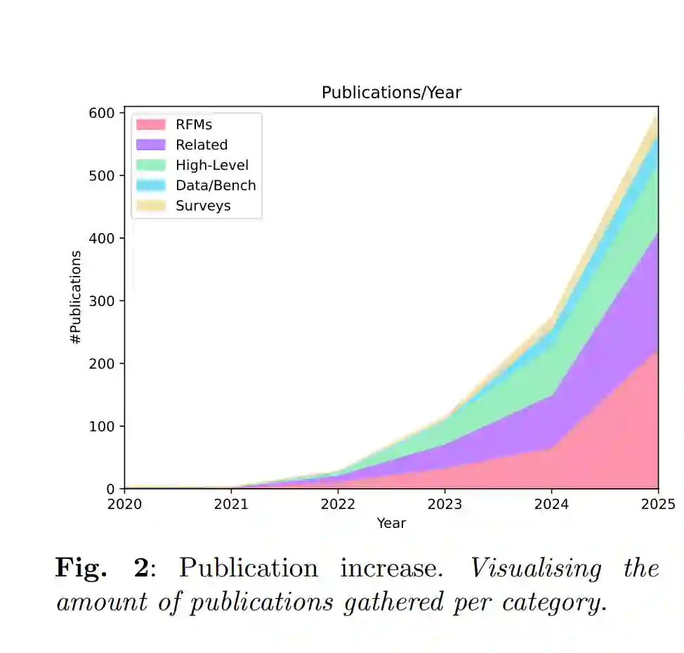 该层级结构突出了与工业部署相关的核心发展轨迹:从刚性的、任务特定的自动化转向适应性强、指令及演示驱动的操作,并不断减少调试投入。机器人领域引入 FM 标志着从专用控制系统 (3.) 向基础机器人学 (4.) 的迈进,产生了跨具身和多任务的控制系统。然而,正如我们随后的分析所示,这一步并不自动等同于工业级自主:迈向真正的通用系统 (5.) 需要诸如稳健的在线自适应、可靠的指令遵循以及不确定性下的安全运行等能力,这些能力在动态且成本驱动的工业环境中尤为重要。 鉴于该领域的发展速度,进行一项立足于工业实际的专项综述势在必行。如图 2 所示,近年来与 RFM 相关的出版物急剧增加,其中 2025 年的增长最为显著。这种爆发式增长存在导致领域碎片化和在缺乏结构化工业评估的情况下夸大宣传的风险。在涉及赋能组件、应用和评估的相关文献中也能看到类似的增长趋势。虽然已有若干综述存在(见第 4 节),但尚未有研究针对 RFM 的工业部署就绪度提供系统性、基于工业影响的评估。同时,文献的快速扩充意味着不定期的情况快照会迅速过时,因此需要一项既能整合当前 RFM 现状,又能提供在模型更新迭代时依然有效的评估框架的综述。