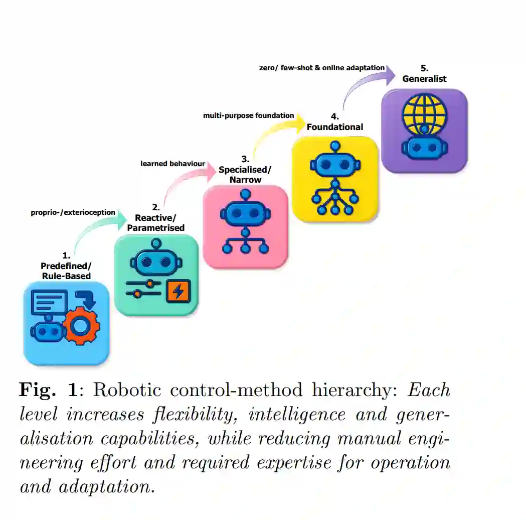 在本综述中,我们专注于能够生成用于直接驱动机器人执行的底层动作的模型——根据我们在第 2 节中的定义,即“用于控制的 RFM”或“集成式 RFM”。因为该接口是现实世界部署的核心,且与工业约束(如延迟、安全门控和特定硬件的动作空间)耦合最紧密。尽管构建此类模型的范式各异——包括基于扩散 (diffusion-based) 的方法 [1, 2]、基于想象 (dreaming-based) 的方法 [3, 4] 以及双系统设计 [5–7]——但我们有意不侧重于架构分类学,因为已有相关工作涵盖了这些主题;关于以架构为中心的综述,请参阅第 4 节。相反,我们采用工业视角,将 RFM 快速的方法论进展与决定此类系统能否在工业环境中部署的实际约束联系起来。为了组织这一讨论并将 RFM 定位于机器人控制的更广阔演进历程中,我们提出了一种清晰的机器人控制方法分类,详见图 1 中的层级结构: 1. 预定义/基于规则 (Predefined/Rule-based):采用固定轨迹或简单触发器,缺乏动态适应能力。转型:通过集成传感器驱动的动态输入进行升级。 1. 反应式/参数化 (Reactive/Parametrised):通过传感器和参数调整实现有限的适应。转型:通过引入学习能力超越预定义行为。 1. 专用/狭义 (Specialised/Narrow):针对给定硬件设置上的特定问题量身定制的解决方案。转型:实现通用的多用途能力。 1. 基础型 (Foundational):经过广泛预训练的系统,能够以极少的人工工程进行高效微调。转型:消除进一步人工调优的需求,实现在线自适应。 1. 通用型 (Generalist):对新任务和配置实现零样本(zero-shot)或上下文内(in-context)泛化,仅需高层指令或在线演示,类似于工业中的人类操作员。