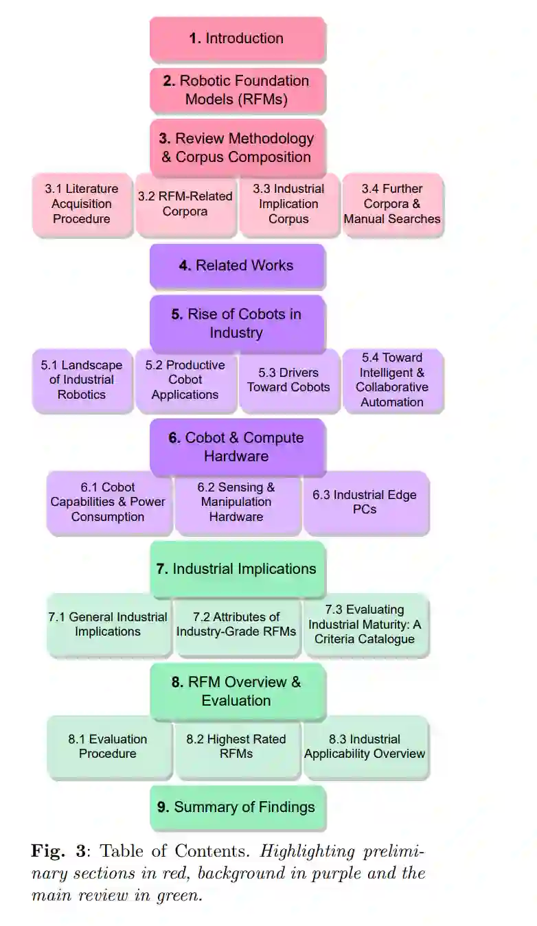 本文的结构安排旨在将基础概念逐步联系到工业需求,随后对当前 RFM 进行系统评估(参见图 3)。我们的主要贡献包括: 1. 机器人控制方法的清晰分类:将 RFM 置于从基于规则的自动化到通用机器人智能的宏观演进历程中(图 1)。 1. RFM 的明确定义与聚类(第 2 节)。 1. 当前 RFM 文献与前沿技术的全面概述:重点关注具备操纵能力的系统(表 D5)。 1. 工业驱动的协作机器人兴起视角:阐明了为什么协作机器人的普及放大了对更通用、可指令化和自适应控制方法的需求(第 5 和 6 节)。 1. 工业部署影响的综合分析:从工业文献中提取出 11 个相互关联的维度,总结为跨领域的工业部署影响(第 7.1 节)。 1. 详尽的评估准则目录:包含 149 个细分项,用于评估 RFM 的工业成熟度(含生态系统要求)。我们认为这是首个为此类工业就绪度评估量身定制的框架(第 7.3 节)。 1. 大规模图景评估:参照此目录对当前 RFM 领域进行大规模评估,阐明了迈向工业级 RFM 必须解决的优势、劣势及研究空白(第 8 和 9 节)。