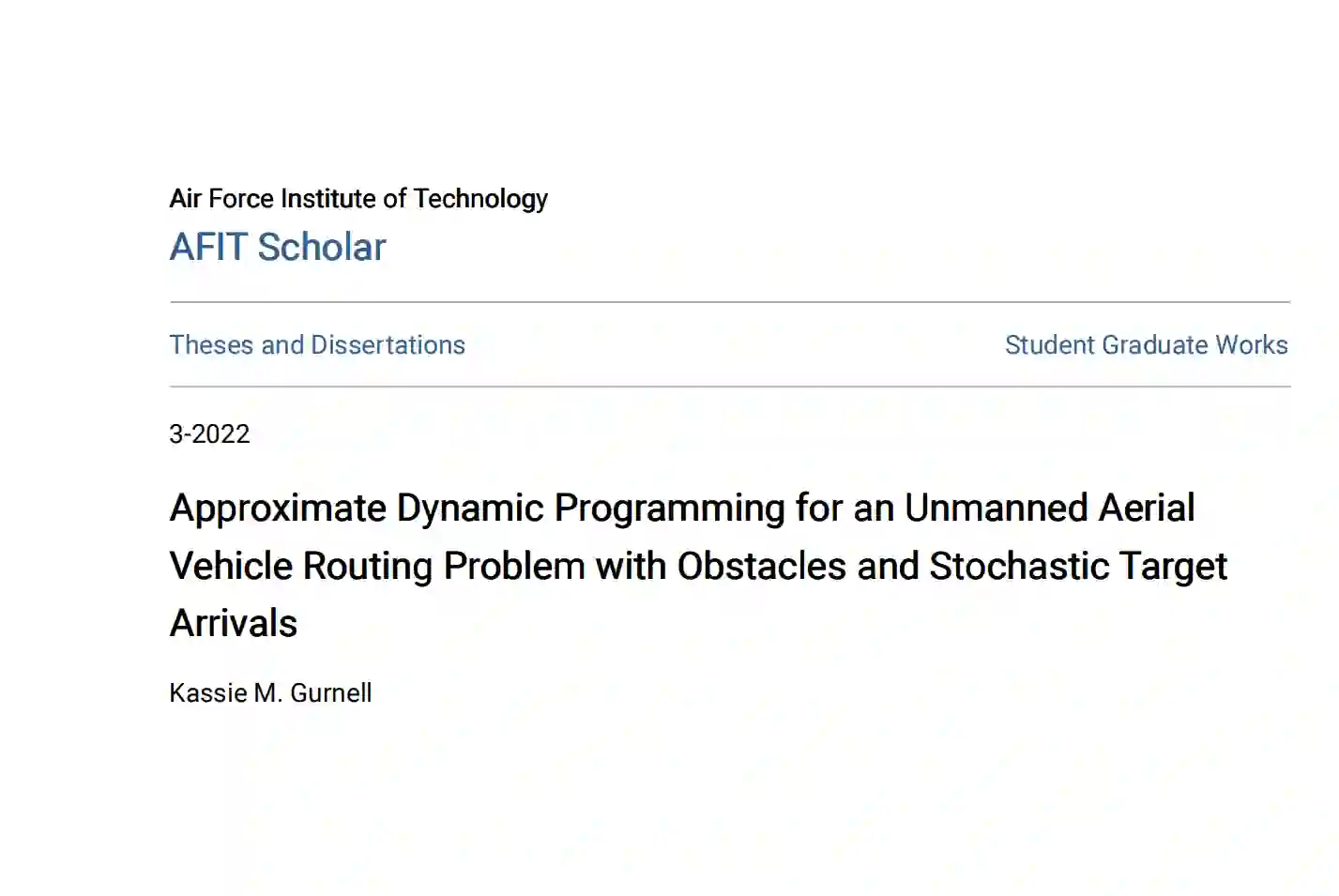美国特种作战司令部(USSOCOM)正在投资人工智能(AI)以加快分析速度(国防部副部长(主计长)/首席财务官办公室,2021)。这篇论文的重点是建立一个人工智能算法,使战斗指挥部,如USSOCOM,能够及时有效地执行目标打击,并对要求的国家情报机构进行侦察。除各司令部外,联合情报支援部队(JISE)和联合特遣部队(JTF)也依赖侦察机,这是因为他们在管理各种形式的侦察和监视敌人方面的作用,这些侦察和监视对了解情况、确定目标和合适的目标以及向部队提供警告是必要的(国防部,2018a)。如果目前的AUCAV路径规划AI算法得到改进,所有这三个适用的军事组织都可以提供更多的情报信息,从而在目前的限制性资源(如燃料容量、弹药或在战区的时间)下,产生更多的目标打击和NAI的图像。