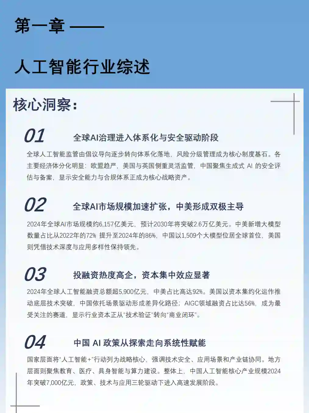 全球AI治理进入体系化与安全驱动阶段 全球人工智能监管由倡议导向逐步转向体系化落地,风险分级管理成为核心制度基石。各主要经济体分化明显:欧盟趋严,美国与英国侧重灵活监管,中国聚焦生成式AI的安全评估与备案,显示安全能力与合规体系正成为核心战略资产。 全球AI市场规模加速扩张,中美形成双极主导 2024年全球AI市场规模约6,157亿美元,预计2030年将突破2.6万亿美元。中美新增大模型数量占比从2022年的72%提升至2024年的86%,中国以1,509个大模型位居全球首位,美国则凭借技术深度与应用多样性保持领先。 投融资热度高企,资本集中效应显著 2024年全球人工智能融资总额超5,900亿元,中美占比高达92%。美国以资本集约化运作推动底层技术突破,中国依托场景驱动形成差异化路径;AIGC领域融资占比达56%,成为最受关注的赛道,显示行业资本正从“技术验证”转向“商业闭环”。 中国AI政策从探索走向系统性赋能 国家层面将“人工智能+”行动列为战略核心,强调技术安全、应用场景和产业链协同。地方层面则聚焦教育、医疗、具身智能与算力建设。整体上,中国人工智能核心产业规模2024年突破7,000亿元,政策、技术与应用三轮驱动下进入高速发展阶段