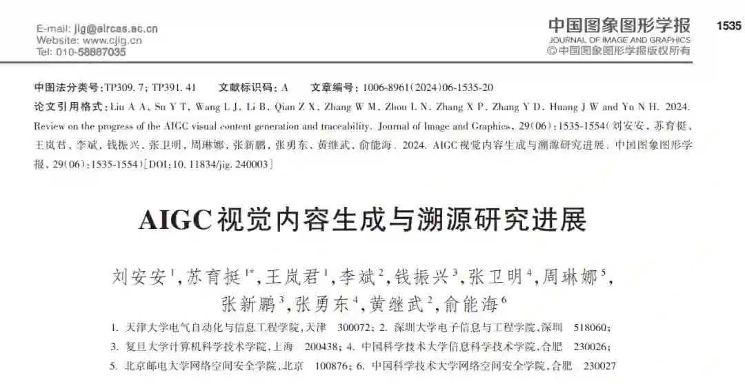 随着数字媒体与创意产业的快速发展,人工智能生成内容(artificial intelligence generated content,AIGC)技术以其在视觉内容生成中的创新应用而逐渐受到关注。本文旨在围绕 AIGC 视觉内容生成与溯源研究进展深入研讨。首先,针对图像生成技术进行探讨,从基于生成式对抗网络的传统方法出发,系统地分析了基于生成式对抗网络、自回归模型和扩散概率模型的最新进展。接着,深入探讨可控图像生成技术,突出了通过布局、线稿等附加信息以及基于视觉参考的方法来为创作者提供精确控制的技术现状。随着图像生成技术的革新和应用,生成图像的安全性问题逐渐浮现。而预先审核和过滤的技术手段已难以满足实际需求,故亟需实现生成内容的溯源来进行监管。因此,本文进而对生成图像溯源技术进行研讨,并聚焦水印技术在确保生成内容可靠性和安全性方面的应用。依据水印嵌入的流程节点,首先将现有的水印相关的生成图像溯源方法归为无水印嵌入的生成图像溯源、水印前置嵌入的生成图像溯源、水印后置嵌入的生成图像溯源以及联合生成的生成图像溯源并进行详细分析,然后介绍针对生成图像的水印攻击研究现状,最后对生成图像溯源技术进行总结和展望。鉴于视觉内容生成在质量和安全上的挑战,旨在为研究者提供一个视觉内容生成与溯源的系统研究视角,以促进数字媒体创作环境的安全与可信,并引导未来相关技术的发展方向。