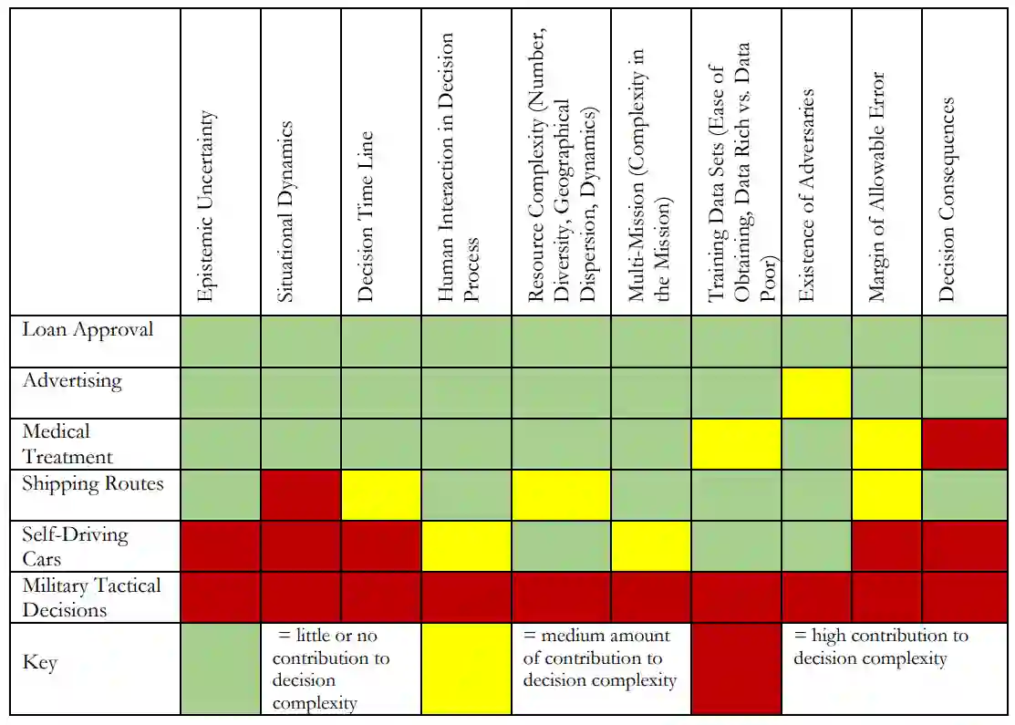 复杂的决策空间为 AI 系统尝试和解决创造了具有挑战性的问题。表 1 根据决策空间的复杂性比较了不同的 AI 应用领域。该表包含 10 个表征决策空间复杂性的因素:认知不确定性(对情境知识的不确定性数量)、情境动态、决策时间线(做出决策的时间量)、决策的复杂性决策过程中的人机交互、资源复杂性(数量、类型、它们之间的距离以及它们的动态程度)、是否涉及多个任务、对手(竞争对手、黑客或打算摧毁的彻底敌人)的存在,允许误差的幅度(多少决策错误是可以接受的),以及决策后果的严重性。
