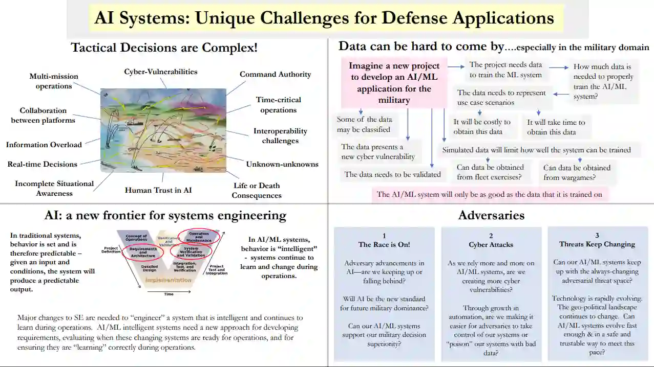 第四个独特的挑战是,对于国防应用,总是需要考虑潜在的对手。在人工智能系统方面,采购界必须注意同行竞争对手国家,他们在人工智能进步方面取得了自己的进步。美国国防系统也必须在这场人工智能竞赛中取得进步。网络攻击在防御系统中总是有可能发生的。随着防御能力增加对自动化和人工智能系统的依赖,这可能会造成更多的网络漏洞。最后,技术正在迅速发展,对抗性威胁空间正在发生变化。国防采购和系统工程界必须确保人工智能系统不断发展和适应,以应对威胁环境的变化,并以可信赖和安全的方式做到这一点。