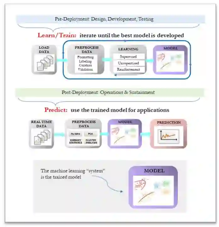 第二个独特的挑战是 AI/ML 系统需要大量相关且高质量的数据用于训练和开发,而这些数据在军事领域可能很难获得。明确编程的手工知识系统在开发过程中需要数据进行评估和验证。 ML 系统在开发过程中对数据的依赖性更大。如图 4 所示,ML 系统从代表操作条件和事件的数据集中“学习”。 ML系统学习的过程也称为被训练,开发阶段使用的数据称为训练数据集。有几种类型的 ML 学习或训练——它们是有监督的、无监督的和强化的。所有三种类型的 ML 学习都需要训练数据集。 ML 系统在部署后或运营阶段继续需要数据。图 4 显示,在运营期间,ML 系统或“模型”接收运营实时数据,并通过使用其“训练过的”算法处理运营数据来确定预测或决策结果。因此,在整个系统工程和采集生命周期中,ML 系统与数据密切相关。 ML 系统从训练数据集的学习过程中“出现”。机器学习系统是数据质量、充分性和代表性的产物。他们完全依赖于他们的训练数据集。