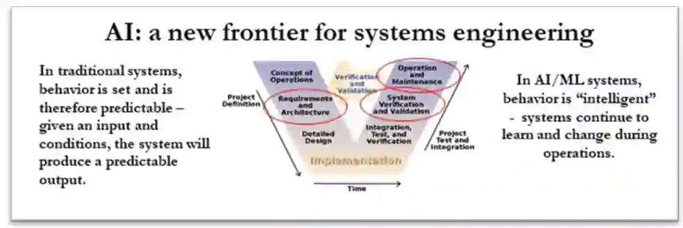 第三个独特的挑战是开发人工智能系统为系统工程提出了一个新的前沿。系统工程方法已被开发用于设计可能非常复杂但也具有确定性的传统系统(Calvano & John,2004)。传统系统具有可预测的行为:对于给定的输入和条件,它们将产生可预测的输出。图 7 说明了对传统 SE 方法(如 SE Vee 过程)进行更改的必要性,以便设计复杂且不确定的 AI 系统。特别是,需要新的方法来定义随时间适应的学习系统的要求,并且系统验证过程可能需要在操作过程中不断发展和继续,以确保安全和期望的行为。对于具有高风险后果的军事系统,几乎没有出错的余地,因此需要实施一个可以确保 AI 系统安全和预期操作的系统工程流程。