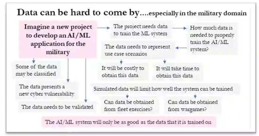 军事领域对开发训练数据集提出了一些独特的挑战——数据可能被分类,数据可能存在网络漏洞(它可能被攻击并被对手故意破坏),如果数据不存在,它可能需要从军事/舰队演习或兵棋推演中获得。数据验证也是一项具有挑战性的工作。