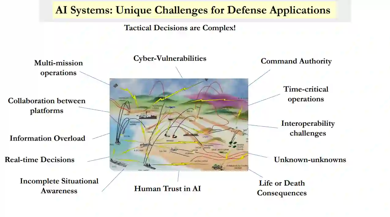 第一个为国防应用实施人工智能系统的独特挑战是战术战争呈现高度复杂的情况。战术复杂性可能涉及信息超载、需要处理的多个并发任务、具有可怕后果的时间关键决策、态势感知的未知/不准确/不完整,以及因各种分布式战争能力所需的互操作性而产生的工程挑战。将人工智能系统添加到这个已经很复杂的环境中是一项必要但极具挑战性的工作。
